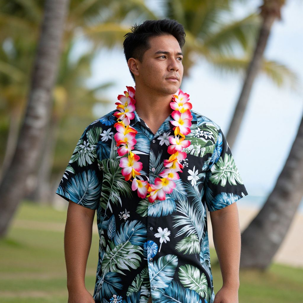 Man Wearing Hawaiian Shirt and Flower Lei Outdoors