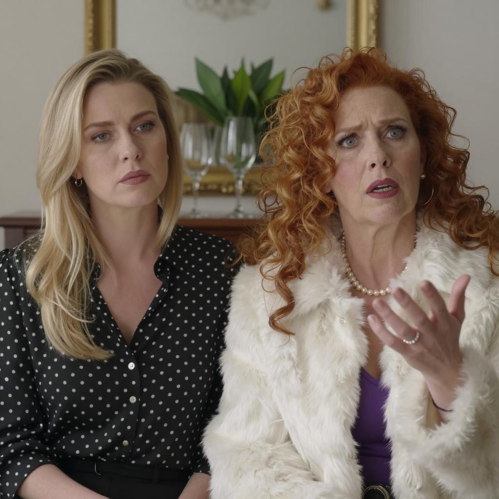 Two women with curly hair, one with dark purple and the other with red hair, wear ornate costumes with green and red patterns. Both have intense expressions with slightly open mouths. The woman on the left has red lipstick, while the woman on the right wears gold earrings and a bead necklace. They are close together in a dimly lit, wooden background.