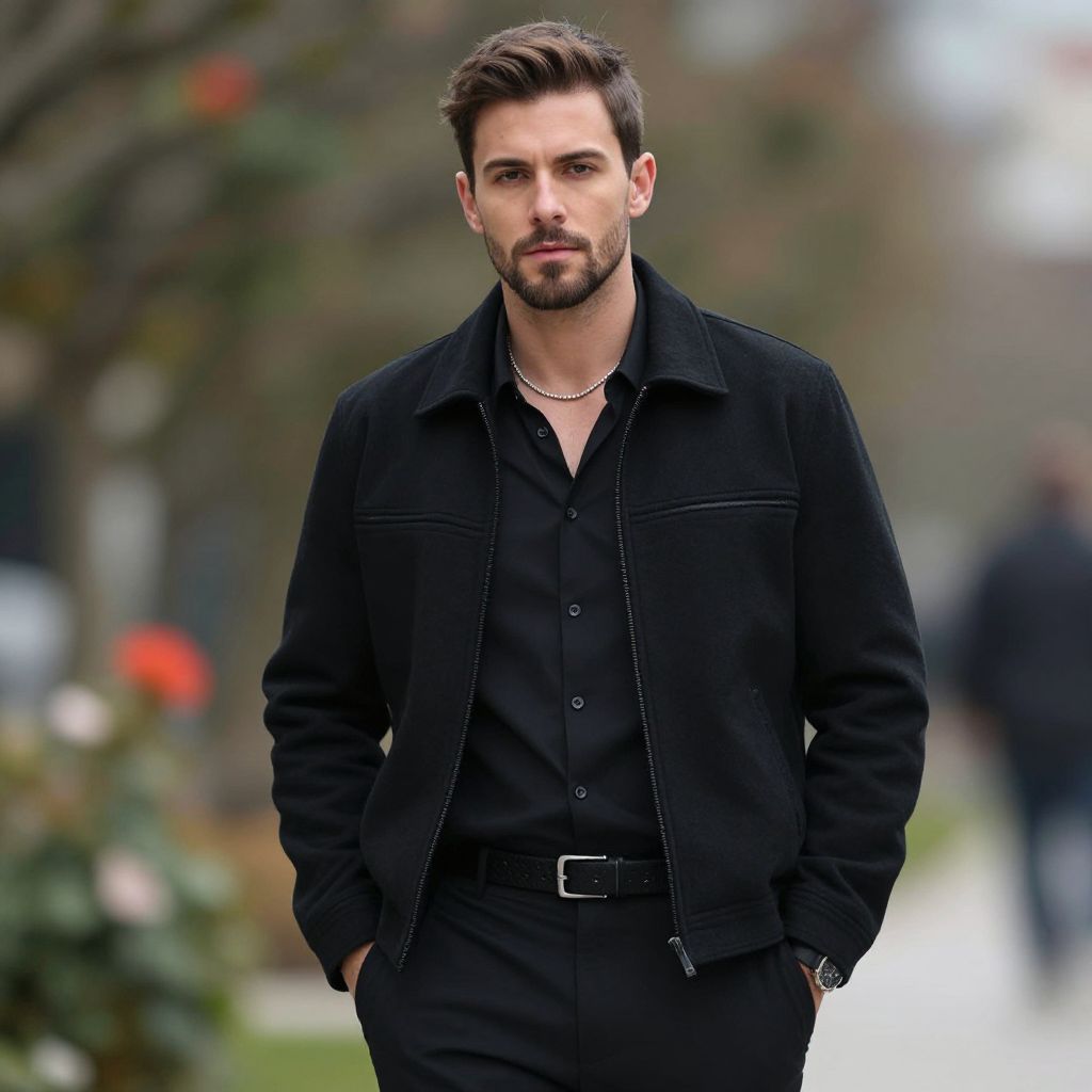Club outfit man, 1boy, male focus, solo, jacket, hands in pockets, pants, belt, blurry background, shirt, blurry, flower, black jacket, facial hair, brown hair, outdoors, looking at viewer, realistic, jewelry, necklace