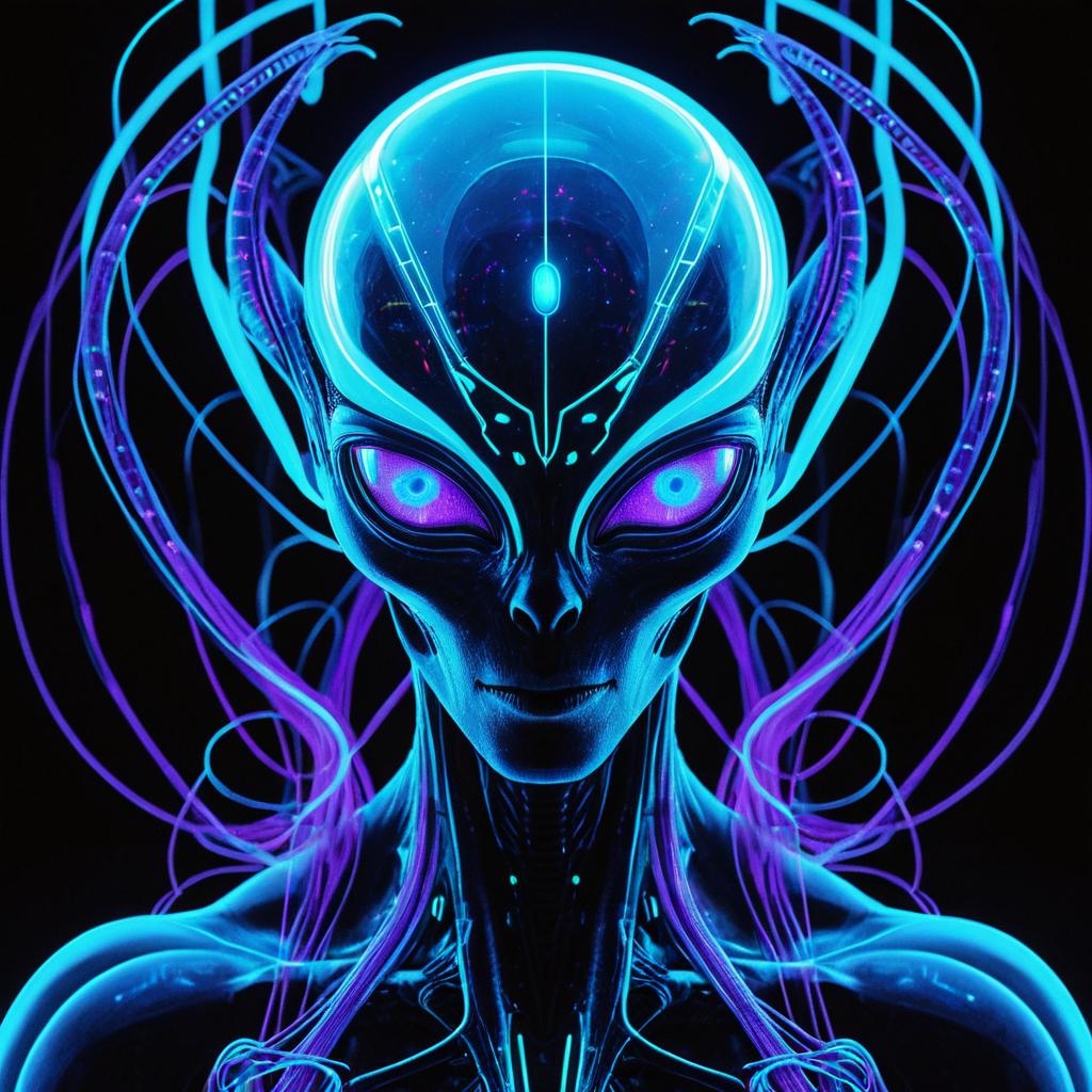 A glowing, translucent outline of an alien envoy, with glowing cyan tendrils and floating holographic symbols. The face reveals its inner workings with bright violet eyes and translucent fiber optic strands. The composition fuses creativity and technology in a dazzling spectacle.