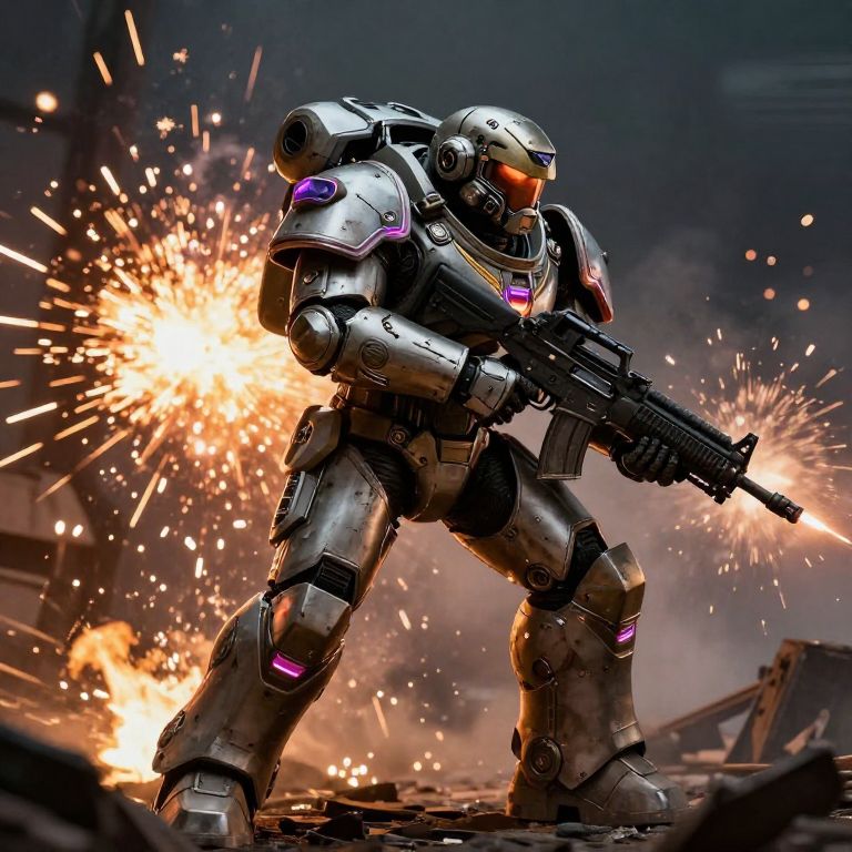 Photorealistic digital artwork of a futuristic armored soldier in a dynamic combat stance. The soldier, clad in sleek, silver metallic armor with purple accents, wields a large black rifle. Bright, explosive orange and yellow fireworks burst in the dark, smoky background, creating a dramatic contrast. The soldier's visor reflects the fiery light, adding intensity. The ground is scattered with debris, enhancing the chaotic battle scene. The image showcases detailed textures on the armor and vibrant, dynamic lighting.