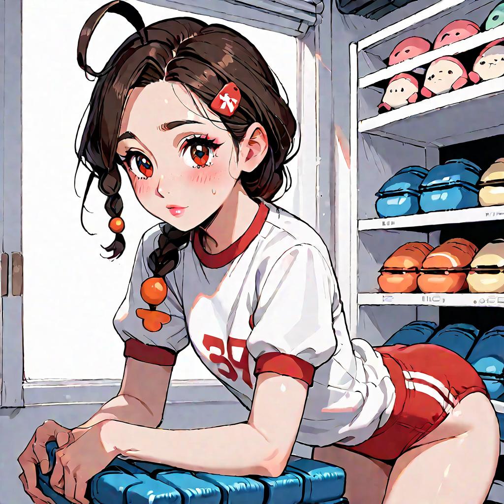 Score_9, source_anime, rating_safe 1girl, aoi, juliana \(pokemon\), single braid, brown eyes, ahoge, gym uniform, white gym shirt, buruma, gym storeroom, blush