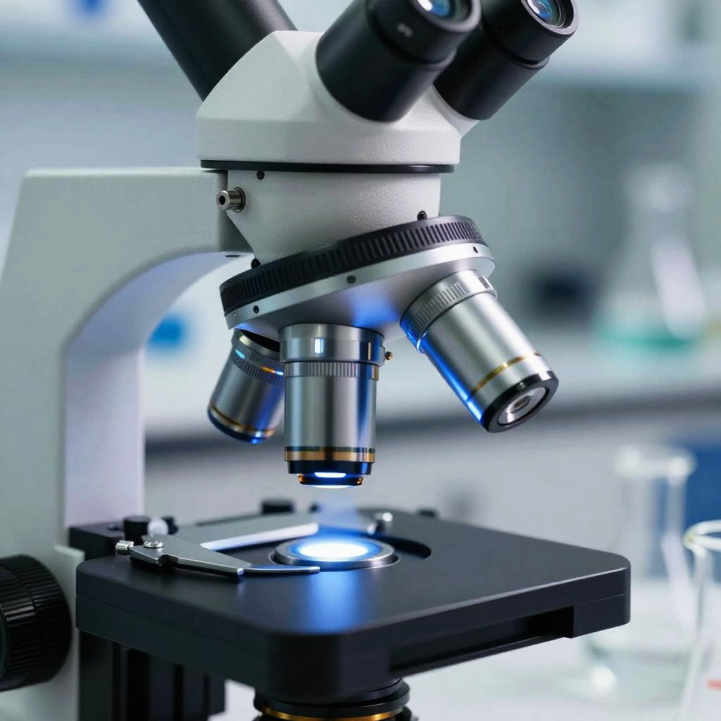 Close-up of a modern eyepiece on a high-powered microscope, sleek black and silver design, illuminated by soft blue LED light, scientific laboratory background with blurred chemical glassware, photorealistic style
