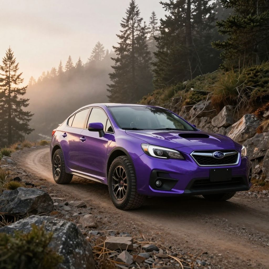 Purple Subaru parked on a rugged mountain trail at sunrise, dramatic lighting with mist and pine trees, detailed off-road tires, realistic textures, adventurous atmosphere