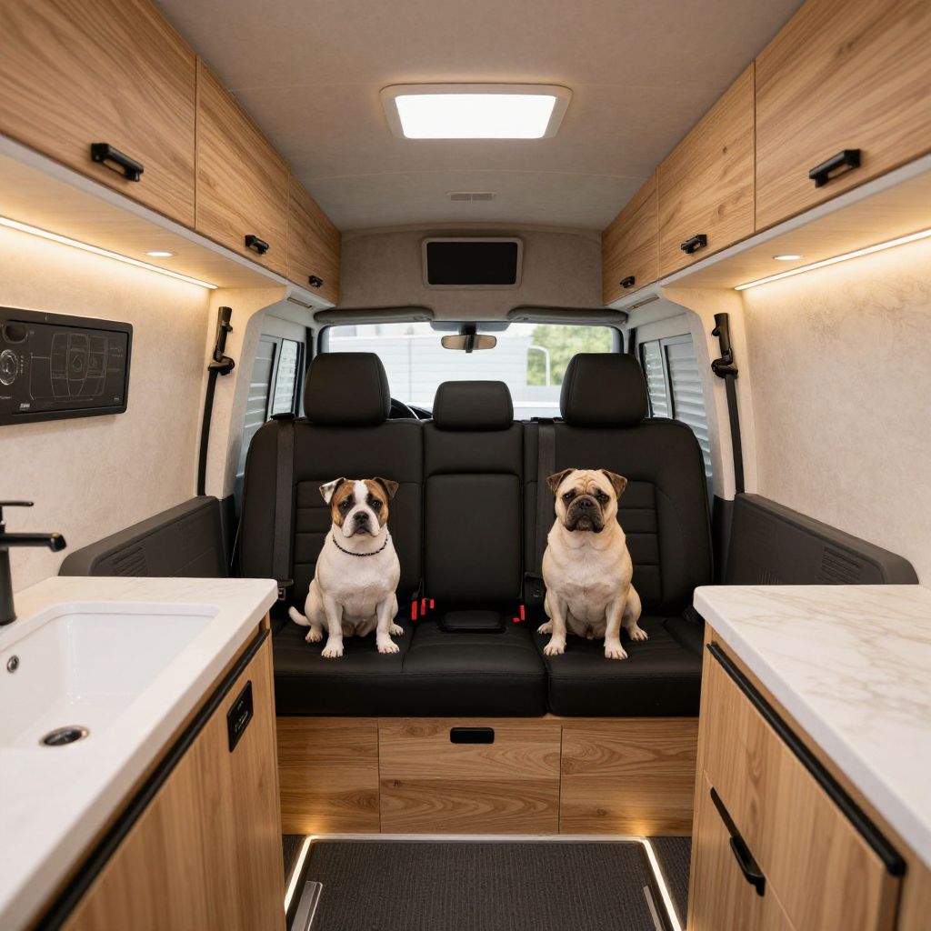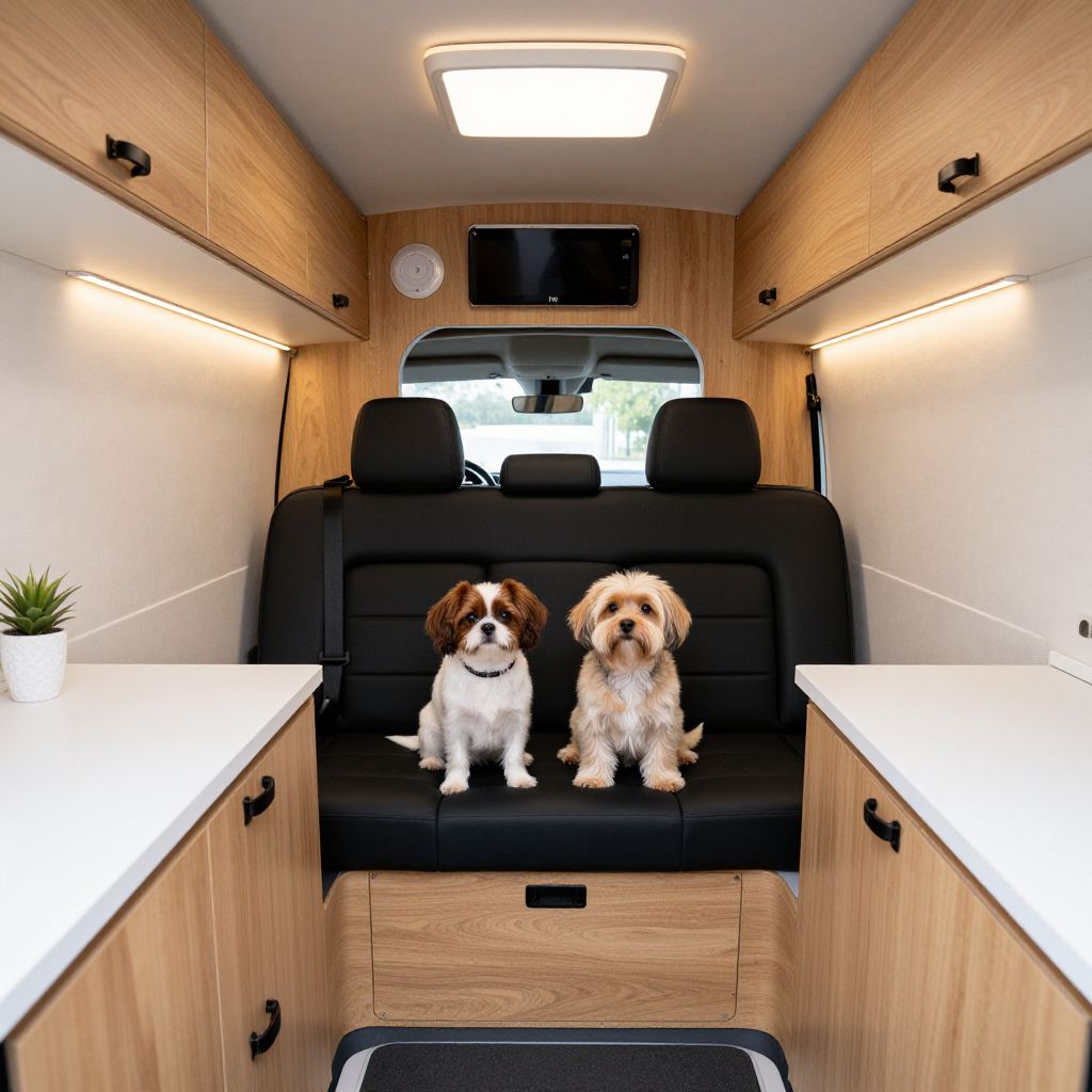 Luxuriously converted interior of a Mercedes-Benz Sprinter camper van, named \"Pluto,\" showcasing two dogs sitting comfortably in the rear, surrounded by custom wooden cabinetry, a sleek black bench seat, and ambient lighting, designed for a woman's journey with her pets.