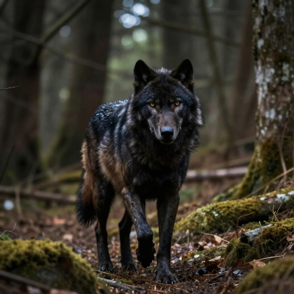 Symbolism of black wolf in a dramatic scene running through dense woods with silver light filtering through trees, representing independence, power, and the unknown, hyperrealistic style