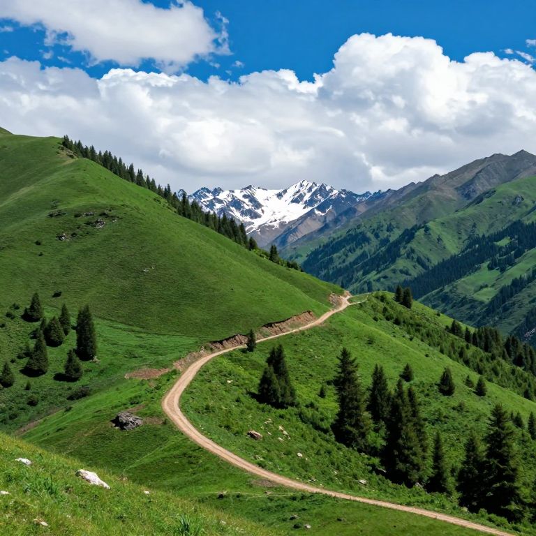 Photograph of a vibrant mountain landscape featuring a winding, narrow dirt road curving through lush green hills. The foreground shows dense, dark green pine trees scattered across the slopes. In the background, snow-capped peaks rise against a bright blue sky filled with fluffy, white clouds. The hills are covered in rich green grass, and the road appears slightly rough with small rocks and dirt patches. The image captures the serene and picturesque beauty of a mountainous region, emphasizing the contrast between the green hills and the white, snowy peaks in the distance.