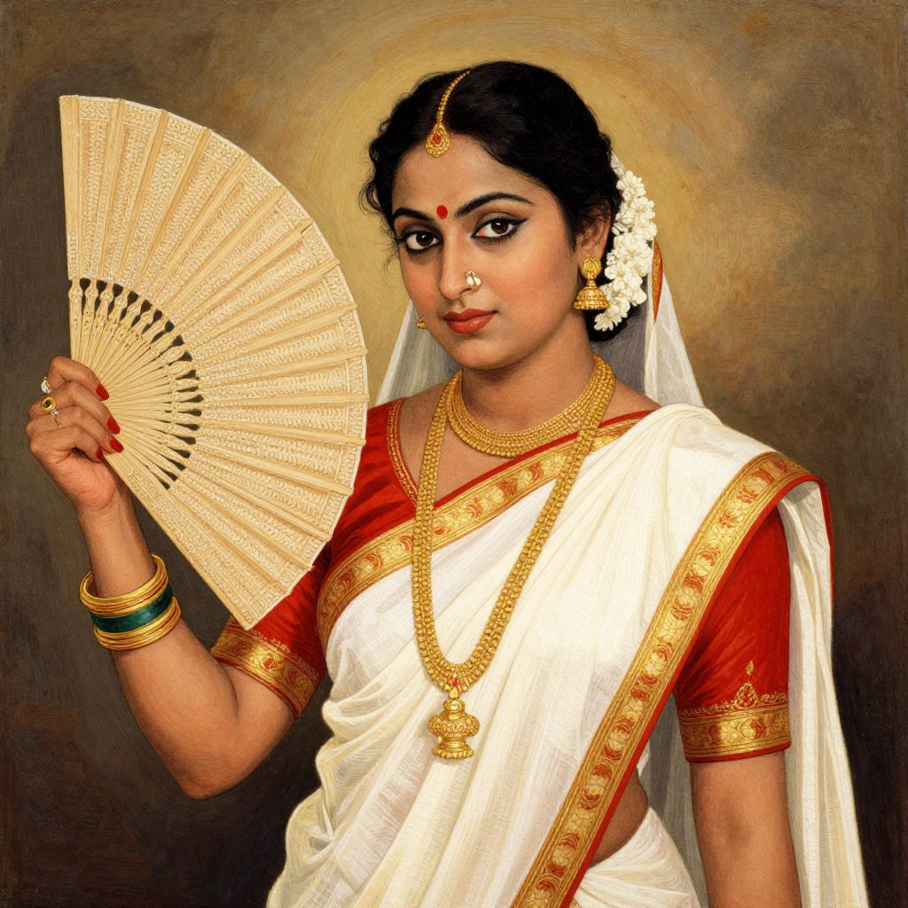 This digital painting portrays a South Asian woman with dark brown skin and black hair adorned with a white jasmine flower. She wears a traditional white saree with a red blouse, gold borders, and jewelry including a gold necklace, earrings, and a red bindi. She holds an elegant, cream-colored fan with black accents in her right hand. Her red lipstick and dark eye makeup accentuate her features. The background is a warm gradient of brown and gold, highlighting her poised and dignified appearance. The artwork has a realistic yet slightly stylized aesthetic, emphasizing cultural attire and traditional beauty.