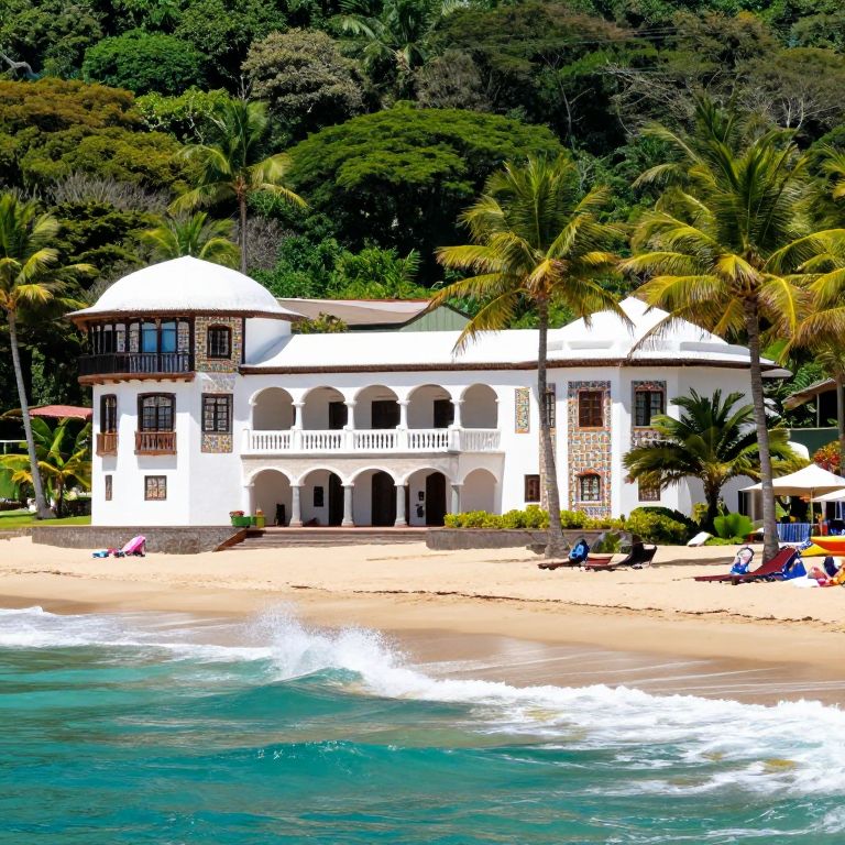 Wes Anderson Production still from 1984 of Jodorowskys trinidad beautiful single story farmhouse at golden hour in a tropical jungle, 20 ASA 35mm,