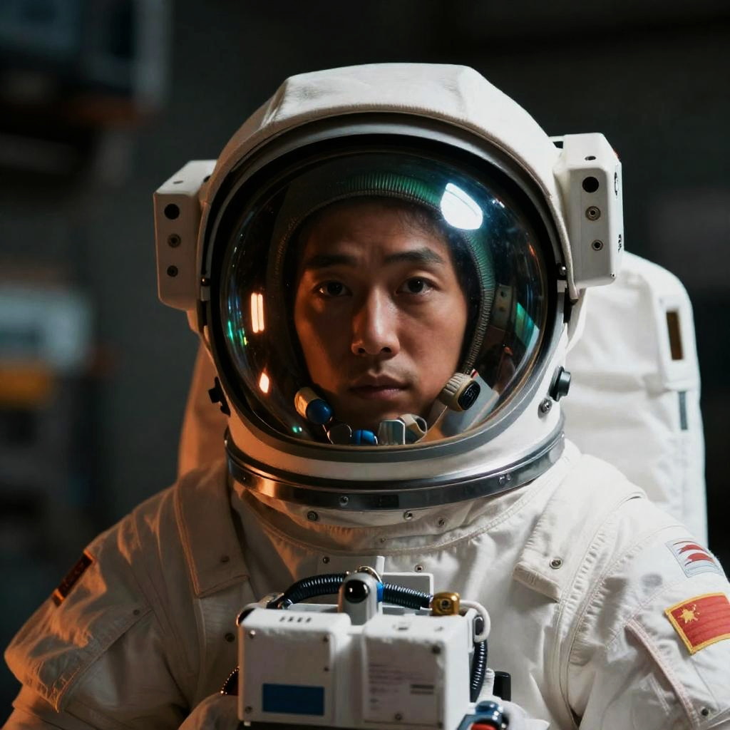 Photograph of three people. Two men in white astronaut suits with helmets, focused on repairing a large space helmet on a table. The third man, in a white shirt and gray pants, sits to the left, observing. Background includes a wooden cabinet and framed picture. Dimly lit room with neutral colors.