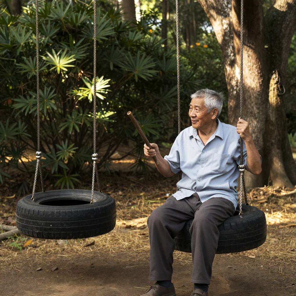 Old man with gray hair, sitting on two black tire swings, holding a stick, in a forest. Leafy bushes and a large tree trunk in the background. Sunlight filtering through trees. Man smiling, looking at stick. Forest floor with dry grass. Ropes connecting tires to unseen support.