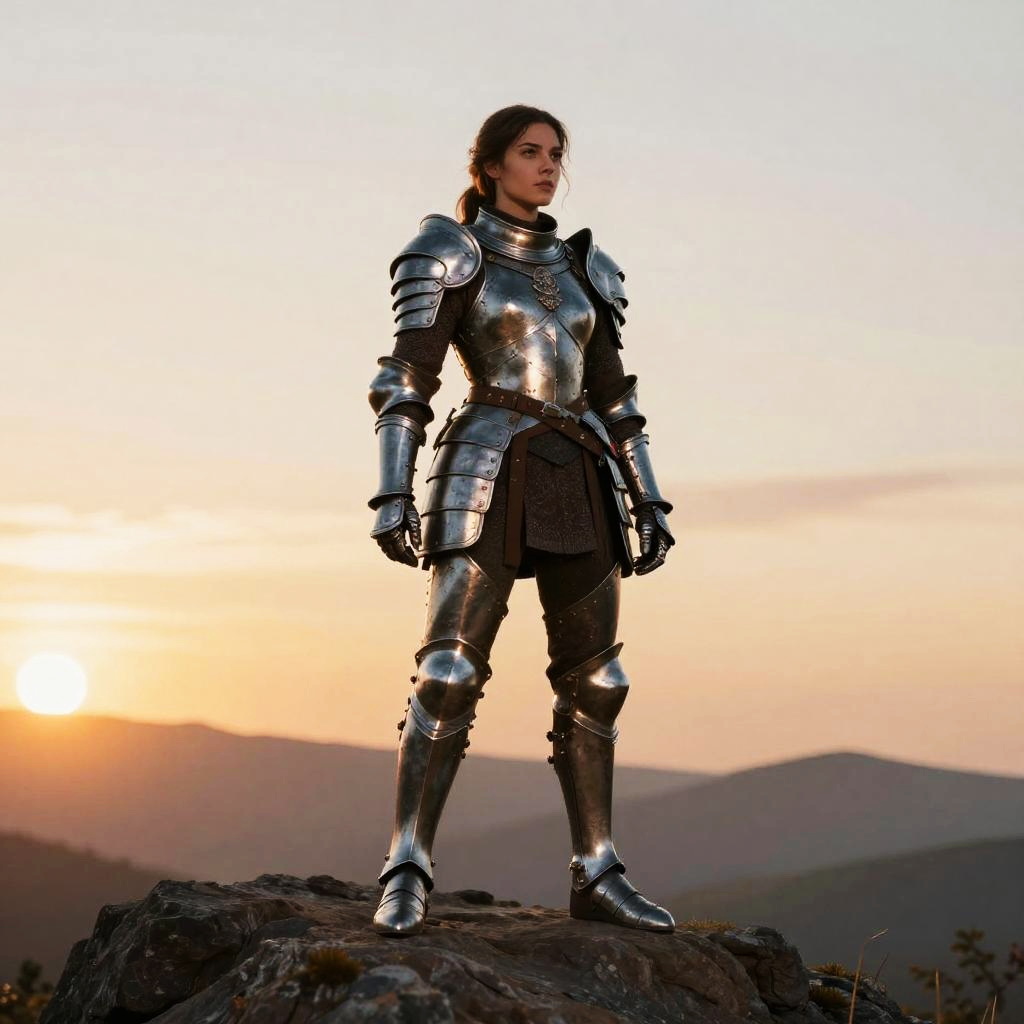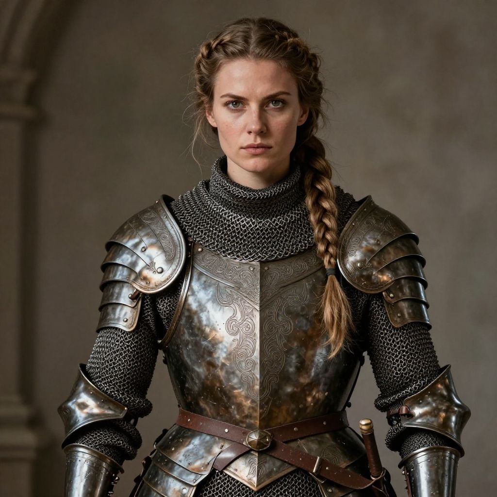 Photorealistic digital art of a stern-faced female knight in shiny silver armor, holding a sword, standing in a dark, arched stone doorway.