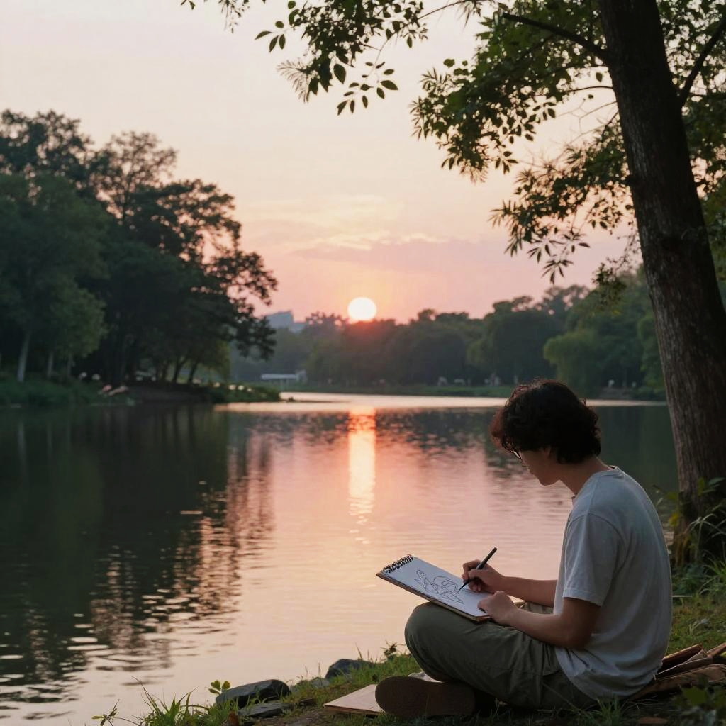 Creating an image of a serene nature scene where an artist is sketching by a tranquil lake at sunset, with soft pastel hues reflecting in the water, surrounded by tall trees and gentle wildlife, evoking peace and inspiration.