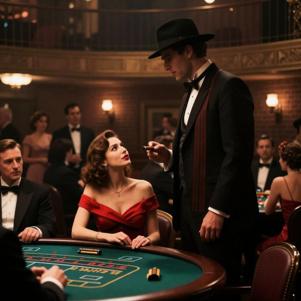 Vintage movie poster illustration. Six people sit around a green poker table. Five men, one woman, facing away. Poker chips and cards on the table. Men wear suits, vests, bow ties. Woman wears pink jacket with yellow back. Serious expressions. Dark wooden background.