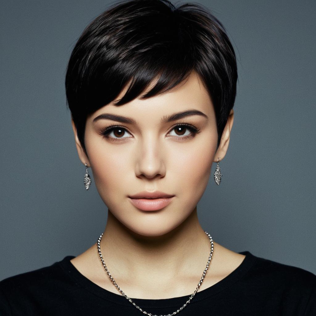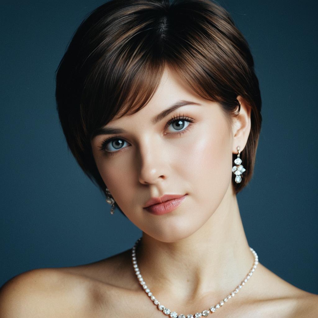 Ash brown short hair,1girl, solo, jewelry, realistic, earrings, necklace, short hair, lips, brown hair, breasts, upper body, looking at viewer