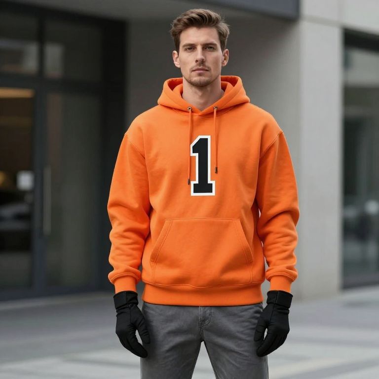 A stylish mannequin standing confidently in a modern retail setting, wearing a white hoodie with bold orange accents on the sleeves and hood, paired with a pair of grey sweatpants featuring intricate black and orange geometric patterns. The mannequin has a clean, sleek, and slightly futuristic design with smooth, reflective surfaces, giving it a polished, high-end aesthetic. The lighting is soft and natural, highlighting the textures of the fabric and the vibrant orange details. The background is a neutral, minimalist store interior with soft shadows and subtle reflections, enhancing the overall sense of contemporary fashion and urban style.