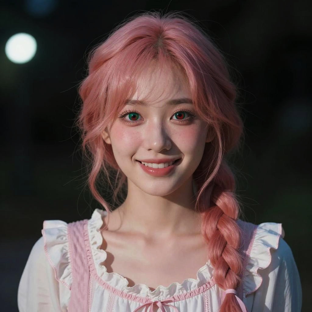 ((masterpiece)), breasts, looking_at_viewer, short hair, (multicolored_eyes:1.5), (pink hair:1.8), bangs, blue_eyes, ((tounge_out, :p, one eye closed)), (long locks:1.4), (ribbon earrings), masterpiece, best quality, high quality, absurdres, shiny skin, colorful, dynamic pose, stunning art, hyper detailed, dynamic angle, beatlful detailed, reflective hair, good lighting, ray tracing, depth of field, ultra-detailed, illustration, Amazing, fine detail, extremely detailed, ((ultra-detailed)), (beautiful detailed girl), beautiful detailed glow, intricate detail, highres, an extremely delicate and beautiful, beautiful detailed eyes, realistic, hdr, rounded eyes, detailed facial features, (illustration), (beautiful detailed eyes), ((very detailed face)), depth_of_field, eyebrows_visible_through_hair, frills, (upper body:1.4), clothes reflecting light, (light diffraction on skin: 1.35), (glossy skin: 1.55), (Iridescence Effect: 1.55), collarbone, white_shirt, long_sleeves, choker, flower, blue camera, blue_skirt, blue_flower, (indoor, potted plant:1.5), critical angle