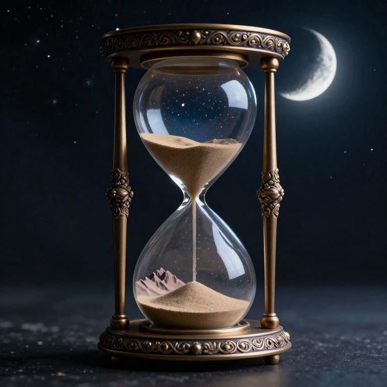 Photograph of an ornate, gold hourglass with sand, set against a dark starry night sky, with a crescent moon visible.