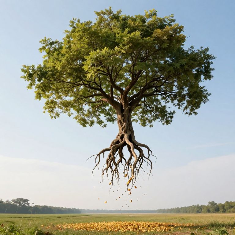 A surreal tree defies gravity, its roots extending upward into the sky like gnarled branches, while its leaves cascade downward, scattering golden seeds across a tranquil landscape below.