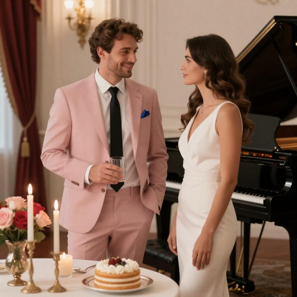 Photograph of three people in a snowy, ornate setting. Central couple: man in white military jacket, woman in red off-shoulder dress, leaning in for kiss. Man's hand on her waist, woman's hand on his chest. Man on left in blue military jacket with red sash, beard, glasses. Background: chandeliers, domed architecture, horseman in silhouette. Snowflakes falling. Woman's head tilted back, eyes closed, man's eyes focused on her.