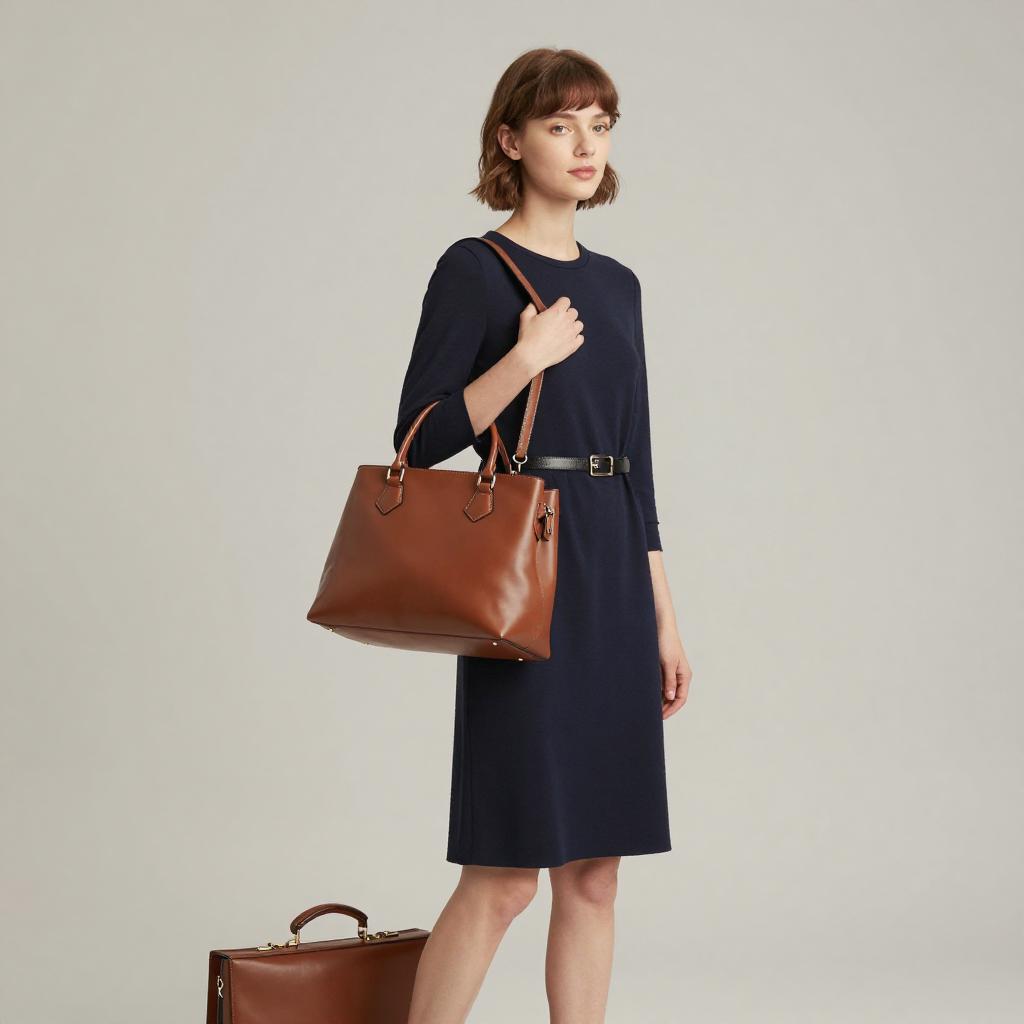 Portrait of a young woman standing against a plain background, wearing a navy long-sleeve dress. She has short brown hair and holds a stylish brown leather handbag over her shoulder. There is also a brown leather briefcase placed on the floor next to her, adding a professional touch to the image.