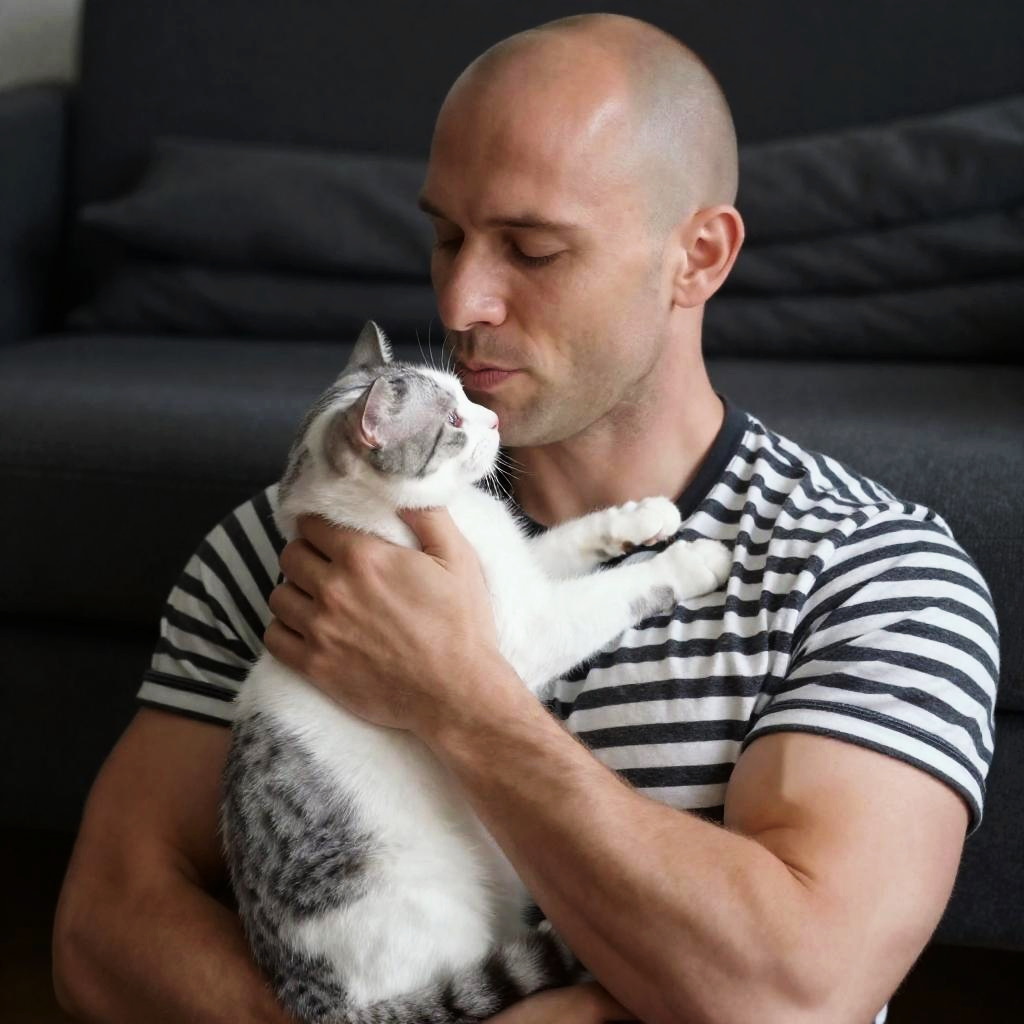 Photograph of a bald, muscular man with fair skin and a striped black and white shirt, holding a small white and gray cat with black stripes. Man has closed eyes, relaxed expression, cat nuzzling his chest. Dark background with folded blankets. Man's arms crossed, cat's head facing left.