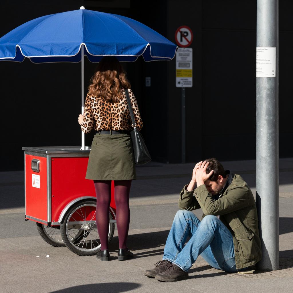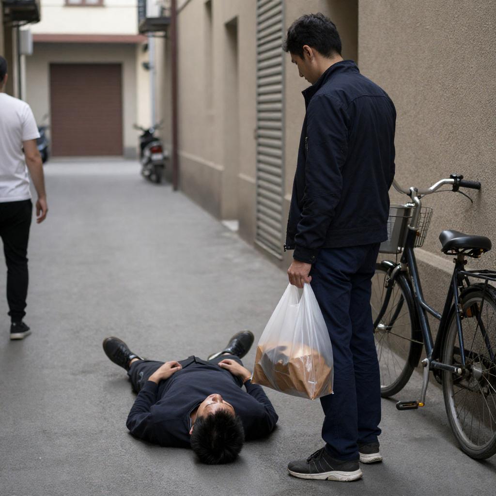 Photograph of an urban alleyway. Man with dark hair, navy jacket, and blue pants stands holding a brown bag and white plastic bag. Another man, dark-haired, wearing dark clothes, lies on the ground with head down. Bicycle on the right. Background includes shutters, another person in white shirt and black pants on the left. Alleyway extends into the distance.