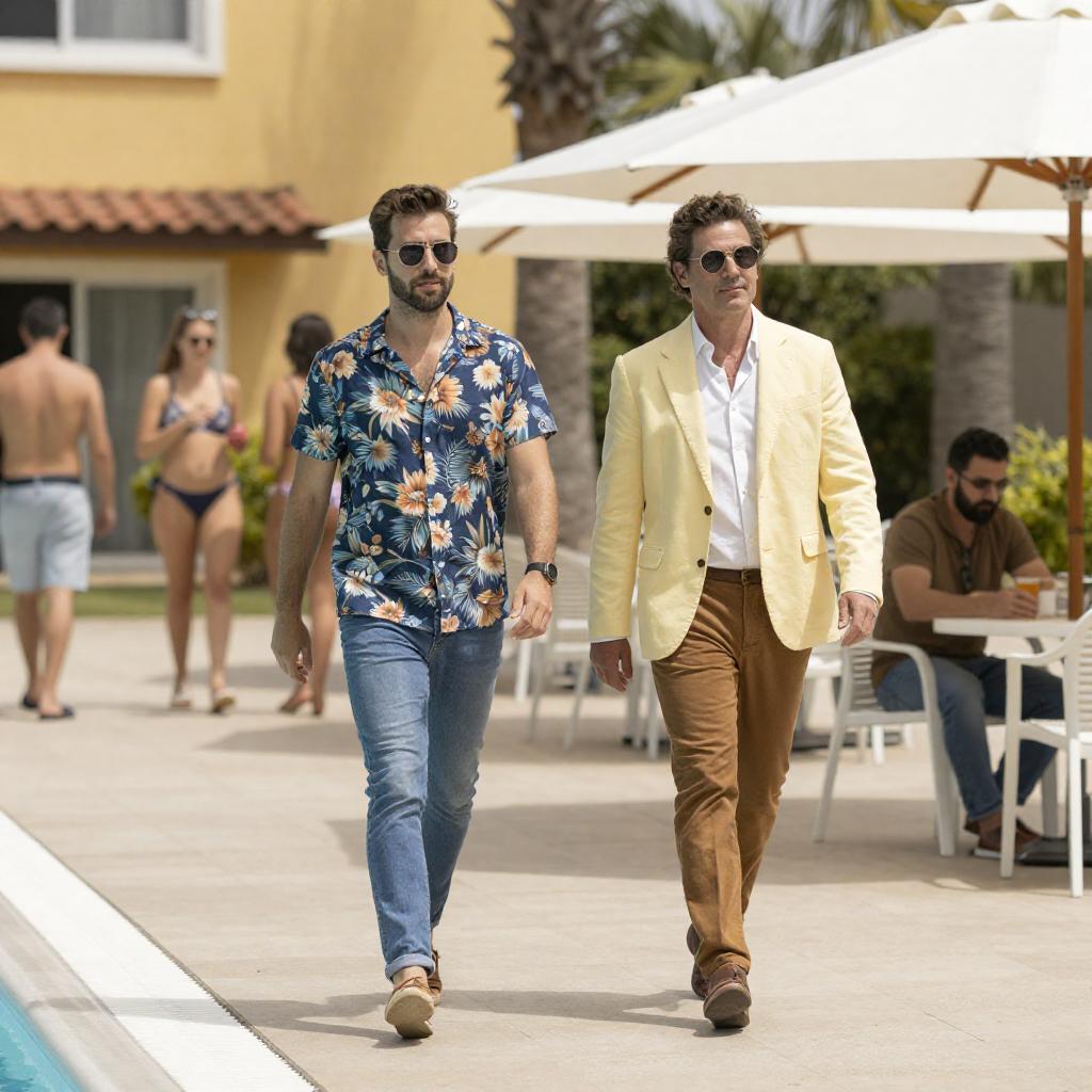 Photograph of a sunny poolside scene. Two men walk in the foreground; one wears a blue floral shirt and jeans, the other a yellow blazer and brown pants. Background includes people in swimsuits, palm trees, and a yellow building. A man in a brown shirt sits at a table on the right.