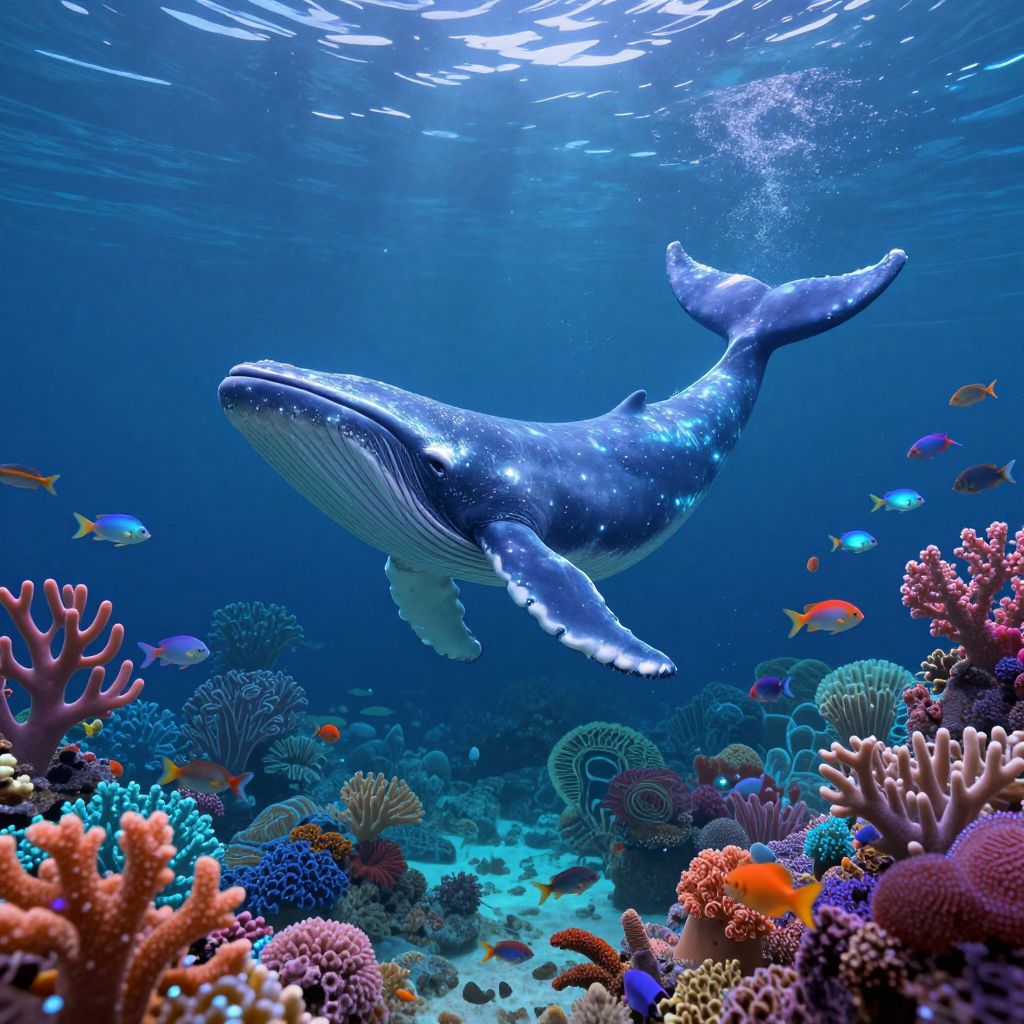 Photograph of a majestic blue whale gliding through a vibrant underwater coral reef, surrounded by colorful fish and diverse coral formations.