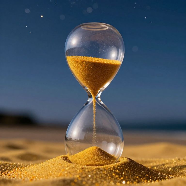 A transparent hourglass rests atop a mound of golden sand, its upper bulb filled with cascading orange grains that slowly trickle through a narrow neck into the lower bulb, set against a starry twilight sky where scattered points of light shimmer above.