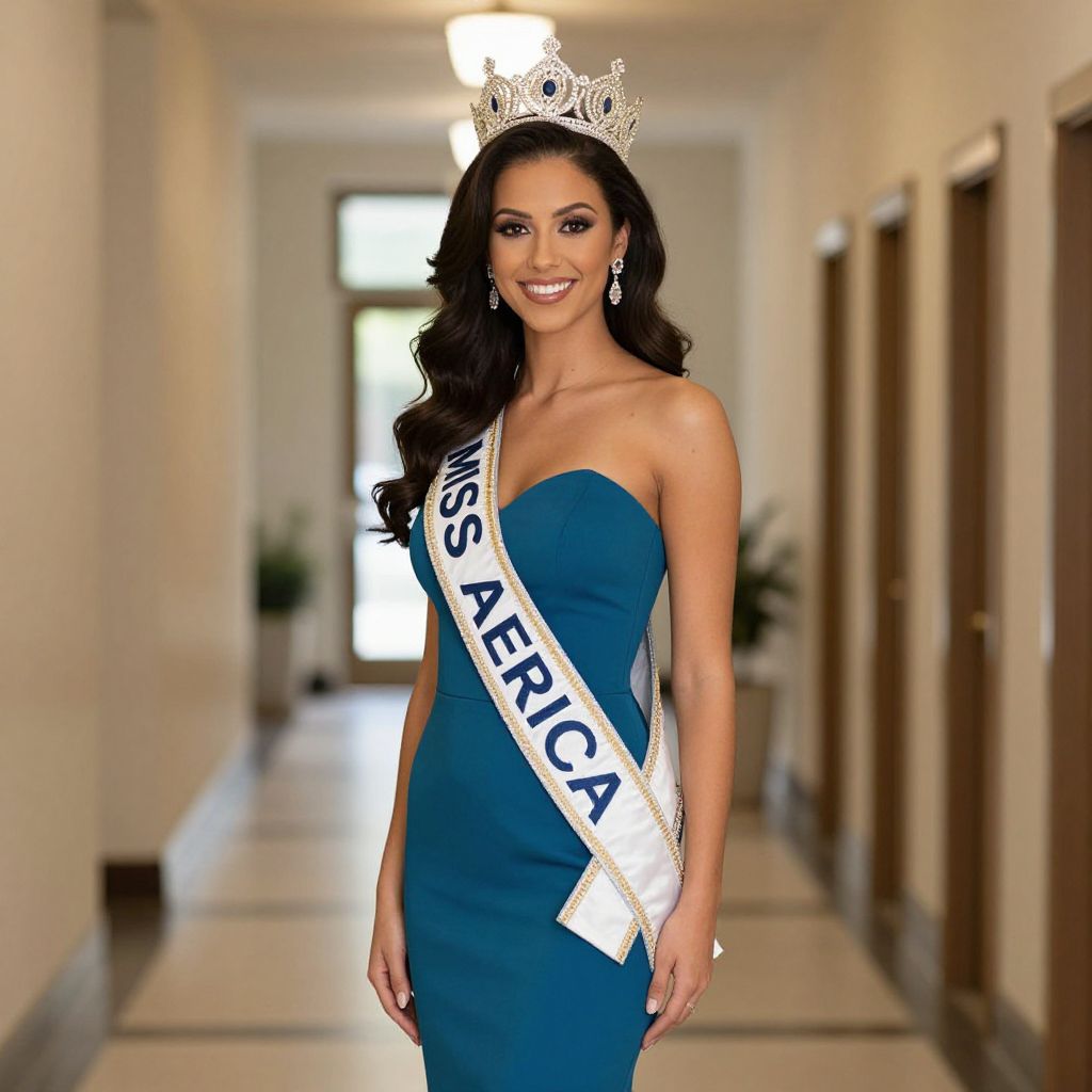 Photograph of a smiling, dark-haired woman standing in a brightly lit, beige-colored hallway. She wears a strapless, form-fitting royal blue dress and a silver crown adorned with jewels. A white sash with "MISS CAROLINA" in blue letters is draped over her left shoulder. She has long, wavy hair and is wearing dangling earrings. The hallway has a tiled floor and wooden doors on the right side, with a window allowing natural light at the far end. The overall atmosphere is formal and celebratory.