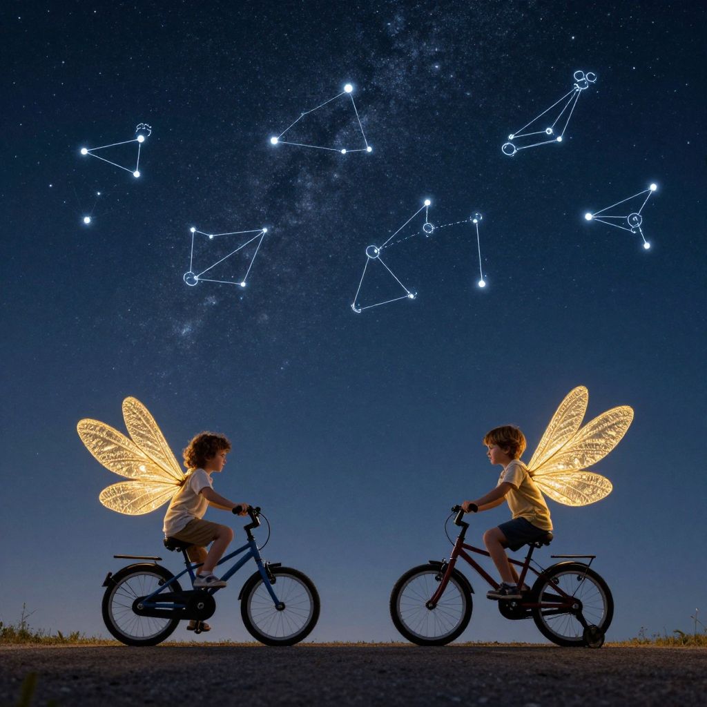 Under a starlit sky where constellations shimmer like whispered promises, two children pedal into the horizon on bicycles adorned with golden dragonfly wings, embodying the boundless freedom and timeless wonder of childhood dreams.