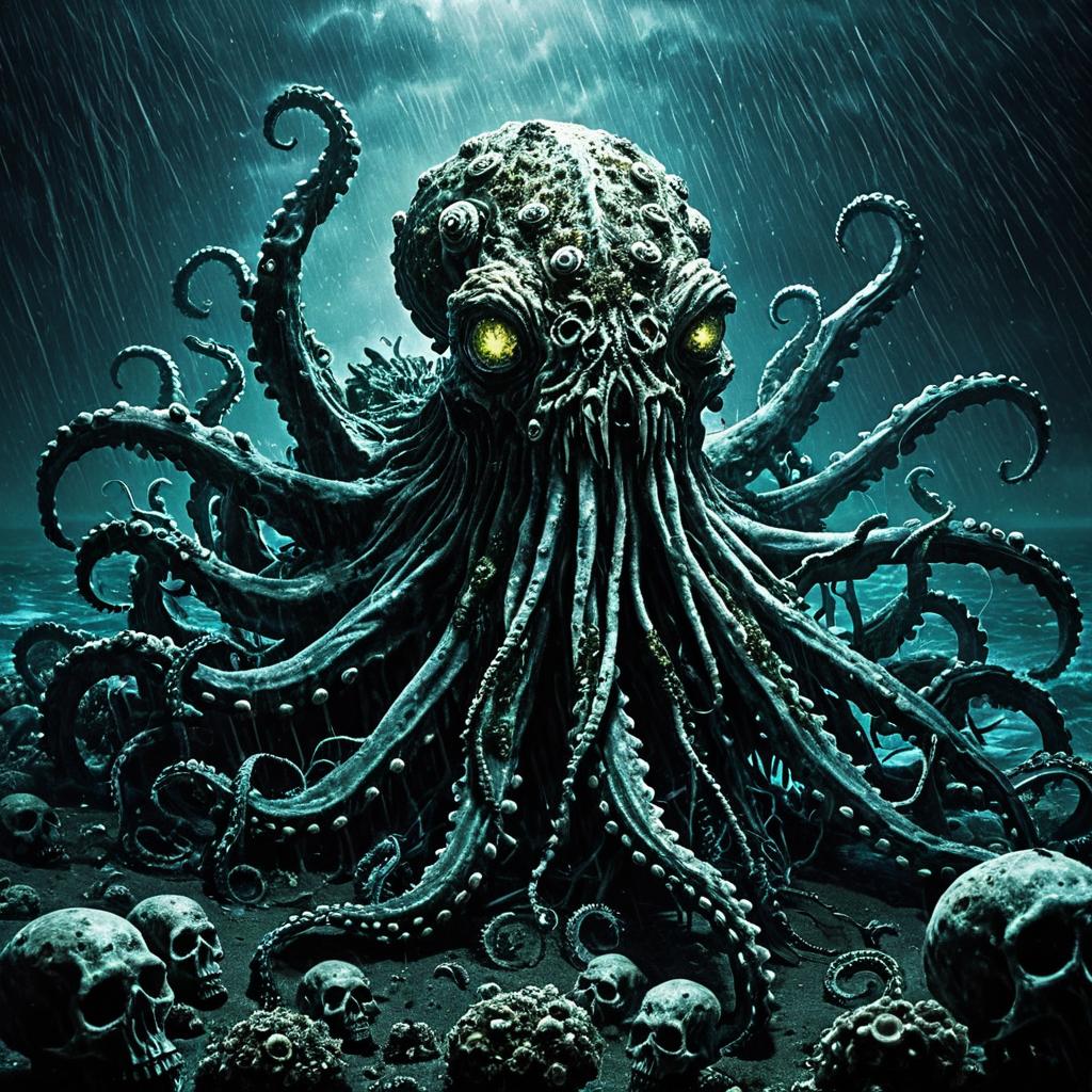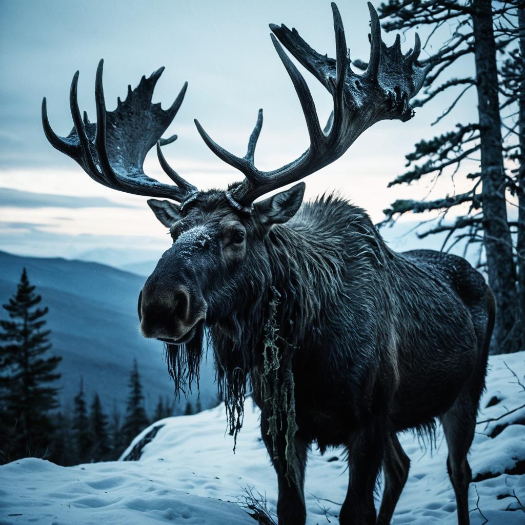 Zombie spectral owl in a foggy pine forest with mystical and eerie, featuring ghostly glowing form with faint bones visibility. The scene includes diffuse moonlight and evokes haunted woodland folklore.