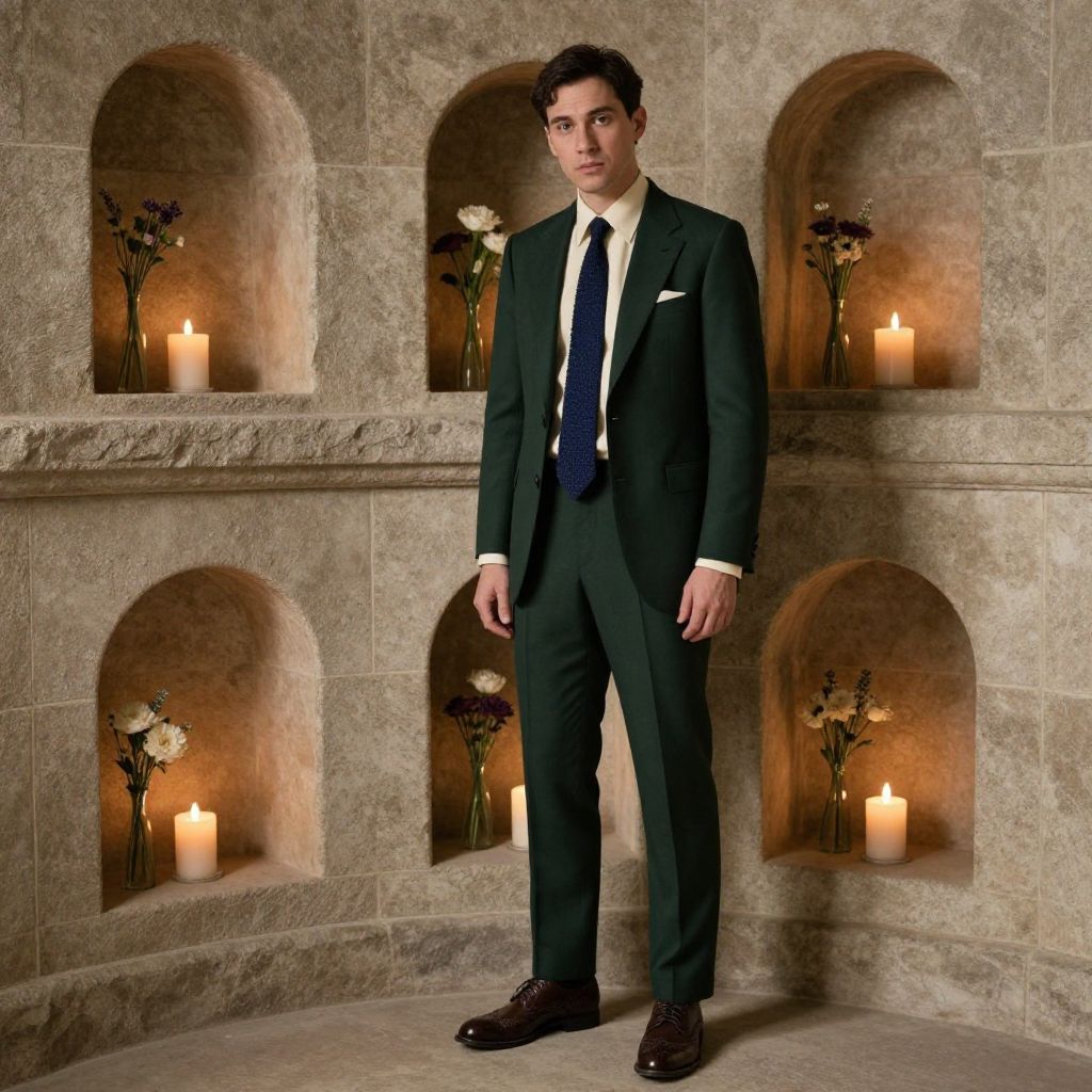 A man, dark green suit, cream dress shirt, textured navy tie, dark brown wingtip shoes, standing amidst ancient stone niches, soft candlelight flickering, fragrant flowers adorning each alcove, vintage photo style, contemplative expression. Man has masculine face and piercing eyes