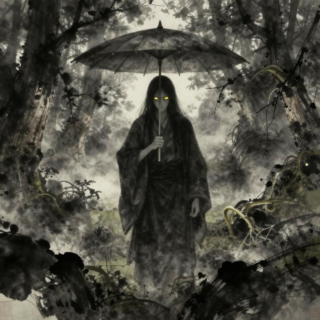 Dark Umbrella Yokai Under Stormy Sky
