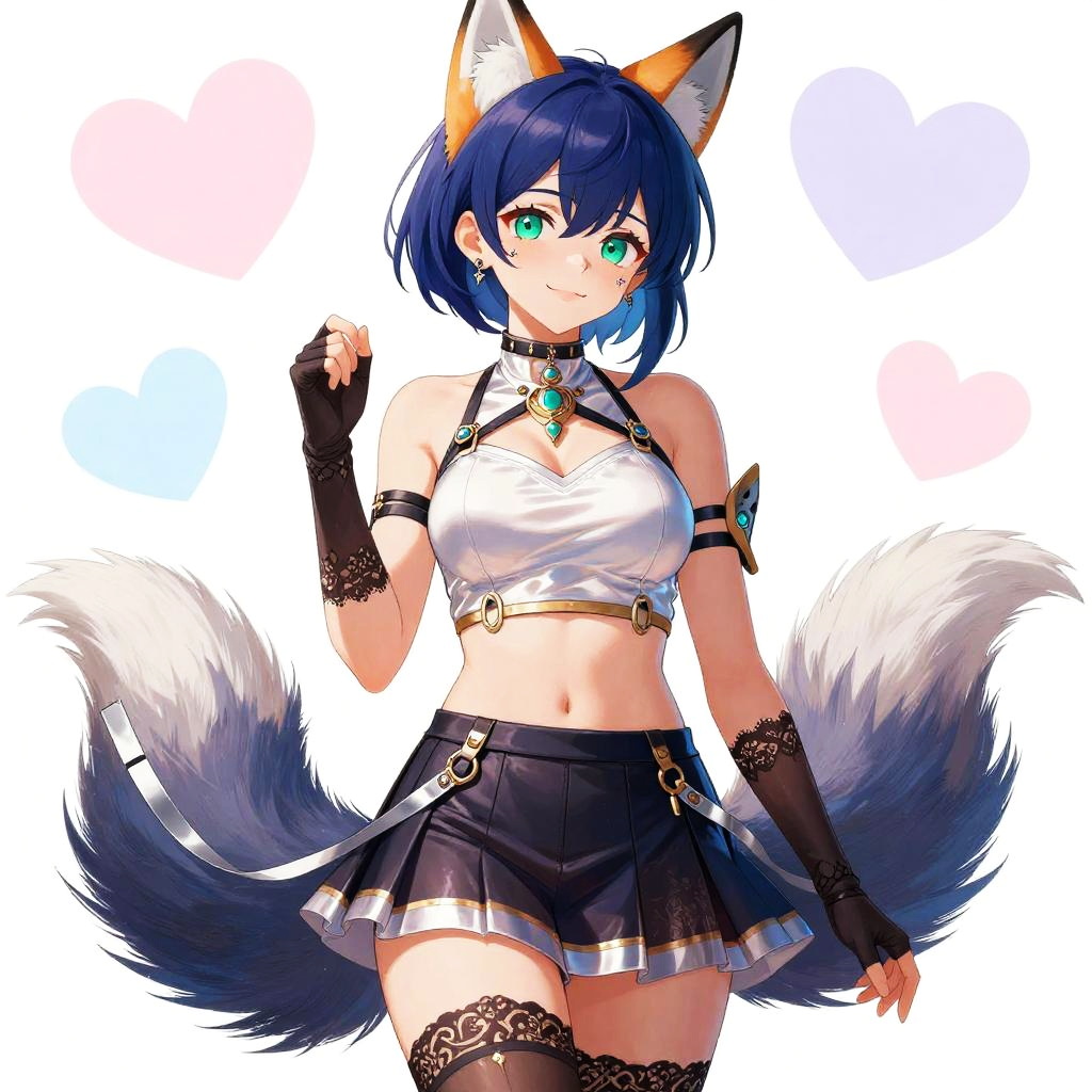 An anime style illustration of a confident young adult woman with a short indigo asymmetrical bob and silver-tipped fox ears, big breasts, wearing a silk halter crop top with high-waisted pleated skirt featuring metallic accents, sheer thigh-high stockings with lace trim, and fingerless lace gloves, and mechanical fox tail with silver ribbons, small ear piercings, and subtle metallic cheek tattoos. She has emerald eyes with a coy, confident smile. The background is decorated with pastel hearts in shades of pink, lavender, and light blue. The artwork is colorful, vibrant, featuring soft shading and smooth line art, capturing a cute, friendly, and lively atmosphere.