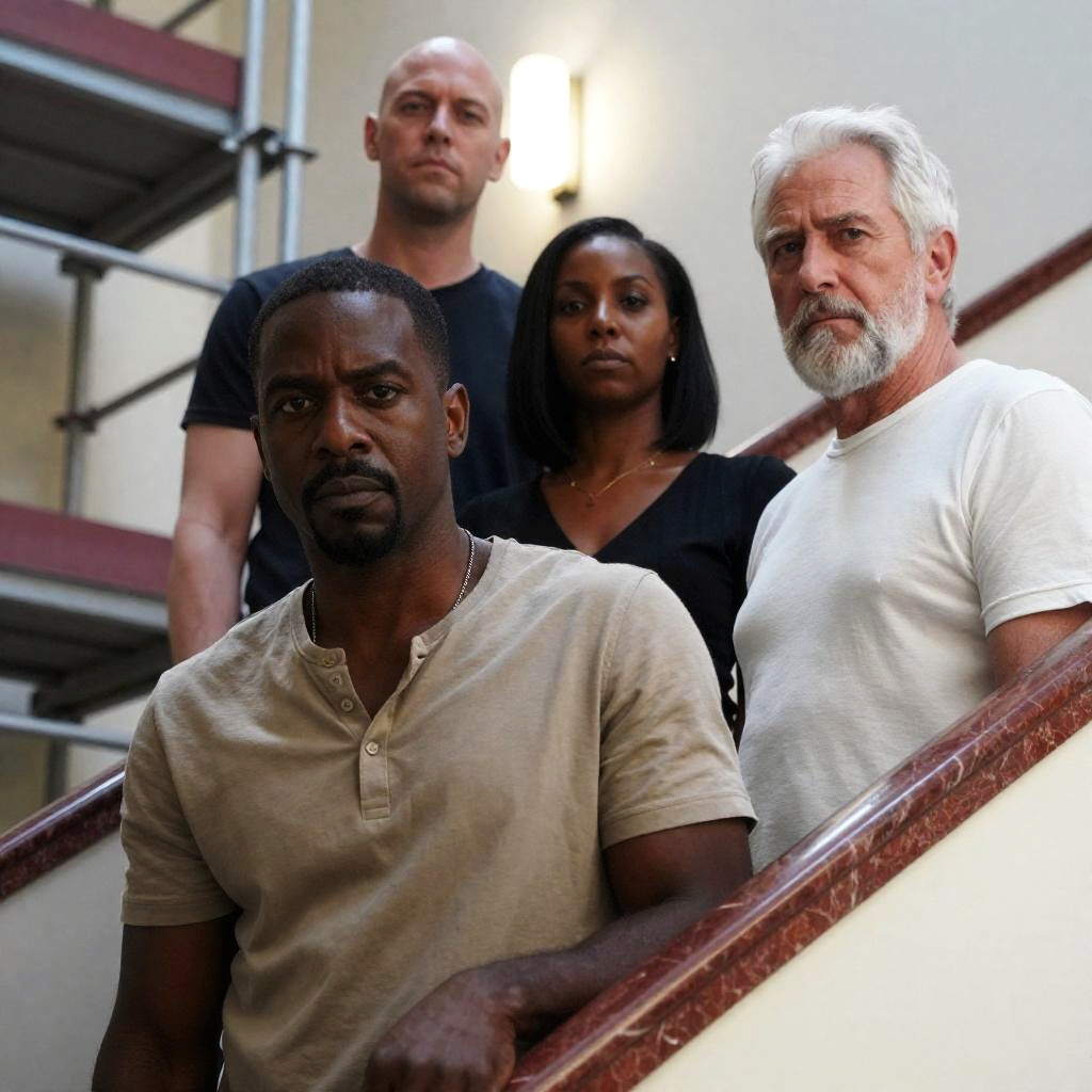 Photograph of two people against a gray, horizontal-paneled wall. On the left, a woman with wavy black hair, brown eyes, and a serious expression wears a dark blue jacket. On the right, a bald black man with a gray beard and a contemplative expression wears a green jacket over a black shirt with red stripes.