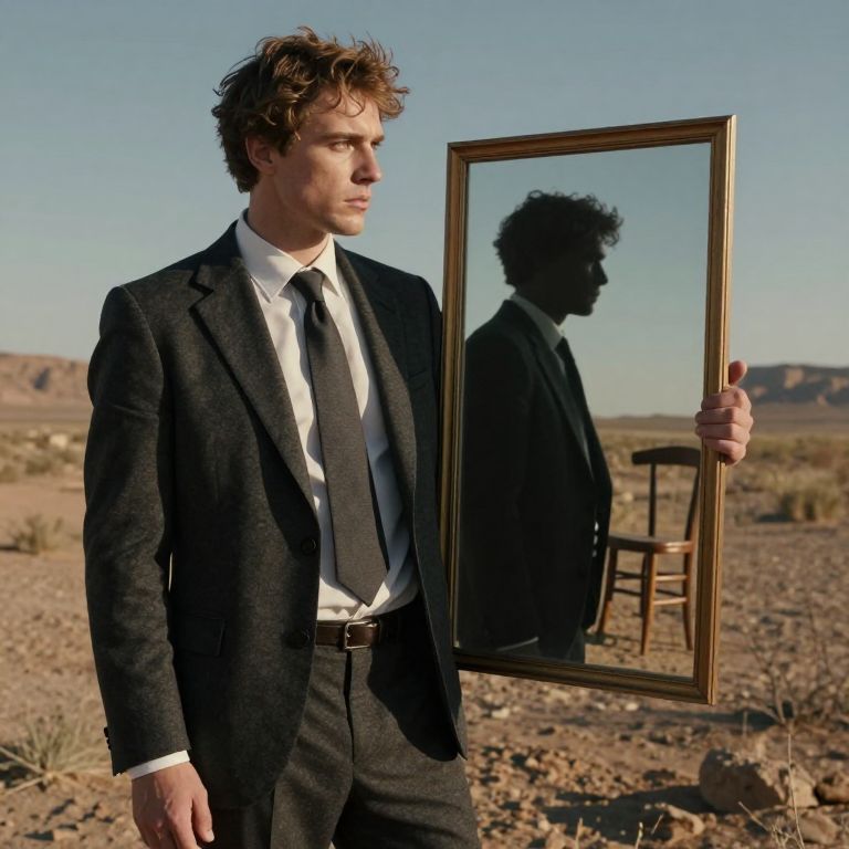A surreal image depicting a well-dressed figure standing amidst an arid terrain, clutching a mirror that reflects their silhouette but strangely incorporates an absent wooden chair instead of the surrounding vista. This thought-provoking composition employs chiaroscuro to highlight dramatic contrasts and create depth, captivating viewers with a juxtaposition of reality and illusion that challenges perceptions of self and existence while showcasing intricate details in facial expressions and clothing textures.