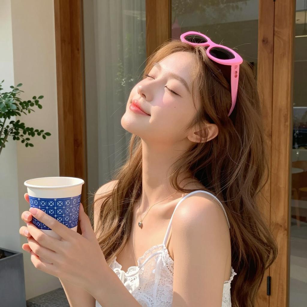 A young woman with light brown hair and fair skin is standing outdoors in soft sunlight. She is wearing a white lace strap top and has pink sunglasses perched on her head. She holds a blue and white patterned disposable cup in her right hand, eyes closed and head tilted back in a moment of peaceful enjoyment. The background features a glass door with a wooden frame and a potted plant on the left side.