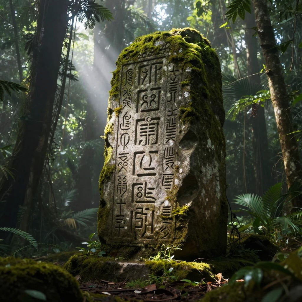 Unidentified ancient stone monument covered in moss in an overgrown jungle, beams of sunlight breaking through thick canopy, mystical symbols carved into the surface, fog surrounding the base, fantasy adventure style, ultra realistic