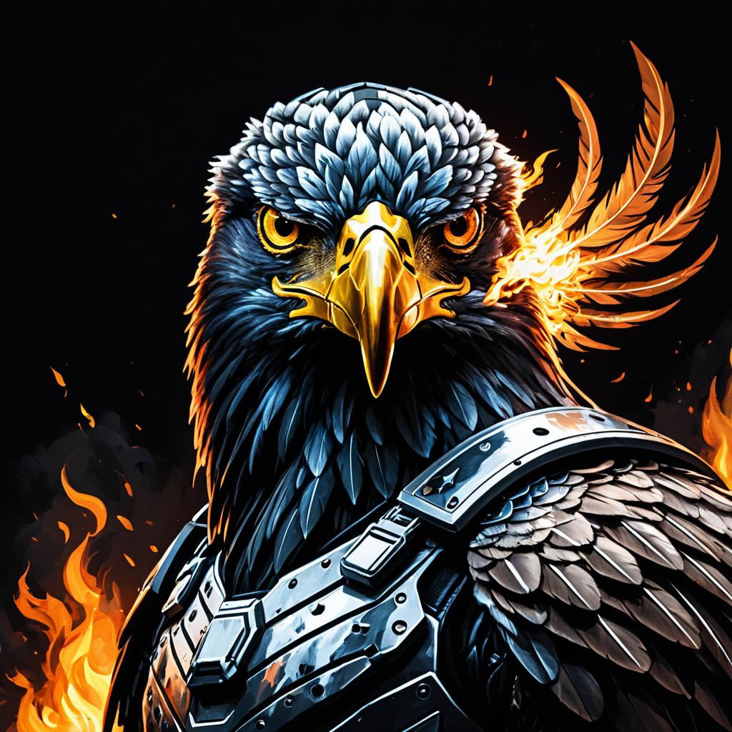 Digital painting of an American eagle depicted wearing stylized futuristic armor resembling USA's Halo helmet. The eagle features flaming feathers in red and orange tones with angular metallic plating and deep shadow contrasts, showcasing high detail and vibrant colors against a black background.