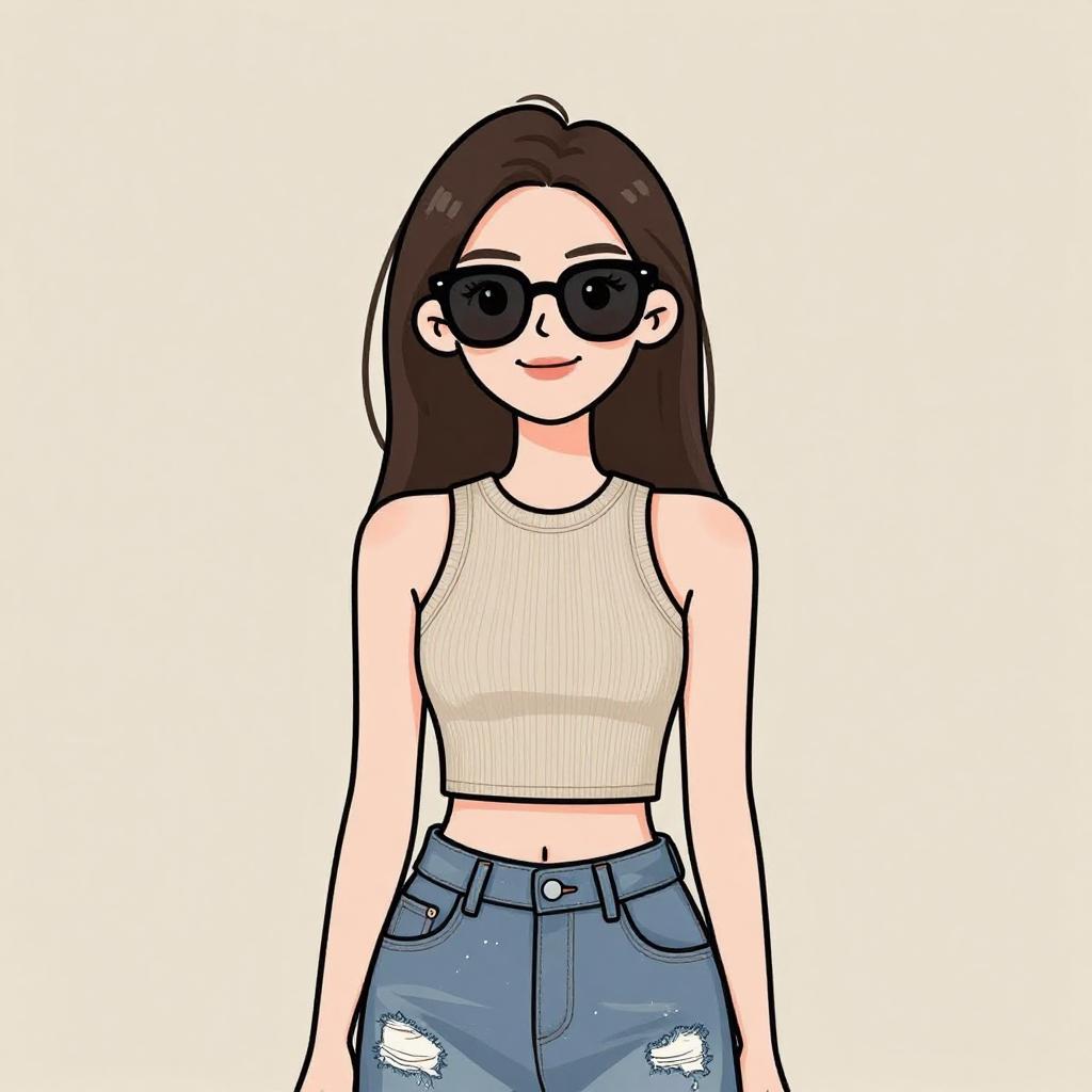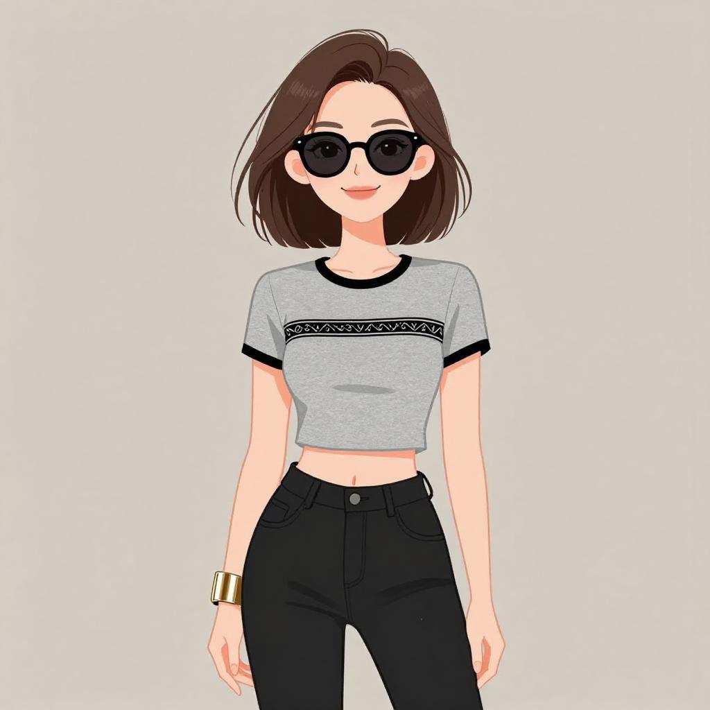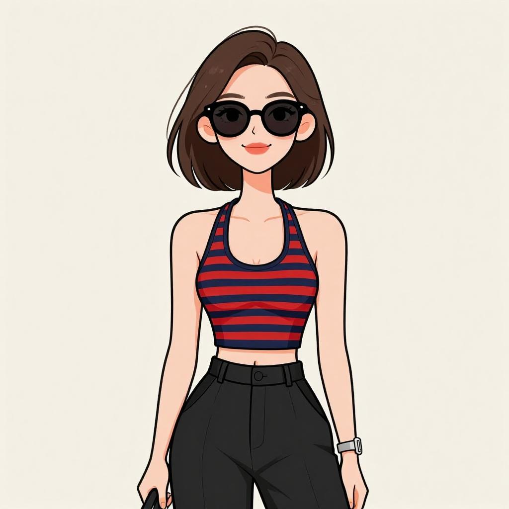 Digital illustration of a woman with short brown hair, wearing black sunglasses, blue crop top, and white pinstripe pants, standing against a grey background