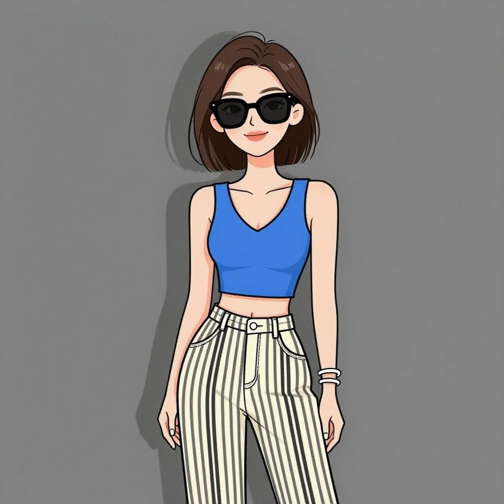 Digital illustration of a young woman with fair skin and straight brown bob haircut, wearing black sunglasses, a blue sleeveless crop top, and high-waisted white and black pinstriped pants. She has a subtle smile and is accessorized with a bracelet on her right wrist. The background is a solid grey color, and her shadow is cast to the left. The art style is clean and minimalist, with bold outlines and flat colors.