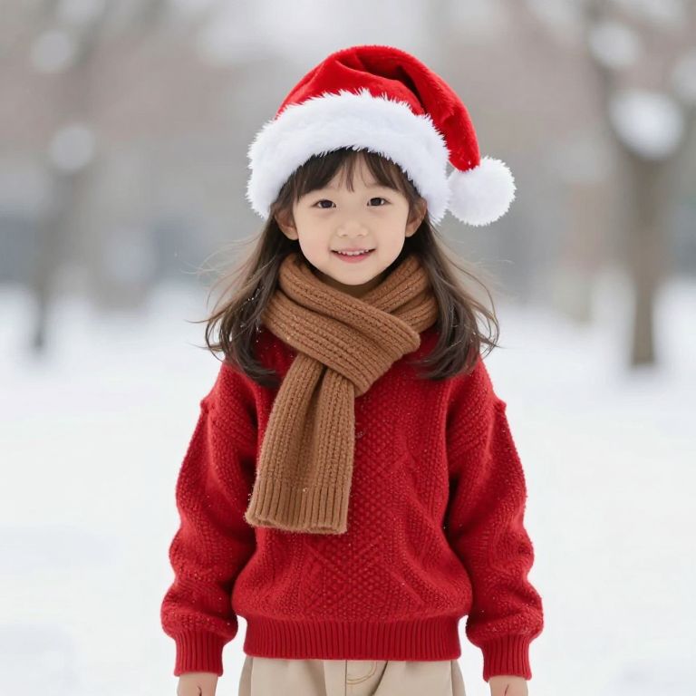 A young girl is wearing a white winter coat with a brown jacket and a red and blue scarf around her neck. She has a white hat with a red feather on top and a black belt around her waist.
