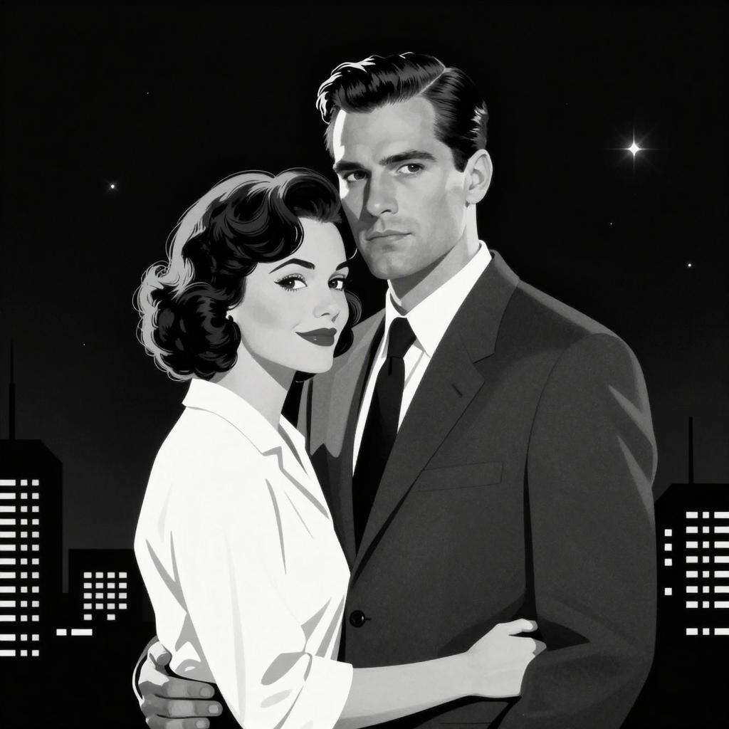 Illustration of a man and woman. Woman in white dress with black zebra stripes, large white hat, pink and white feathers, and white gloves. Man in brown suit, gray hat, red tie, and white shirt, gesturing with right hand. Background split between blue and white. Woman's intense gaze, man's focused expression. Both standing close. White space on right.