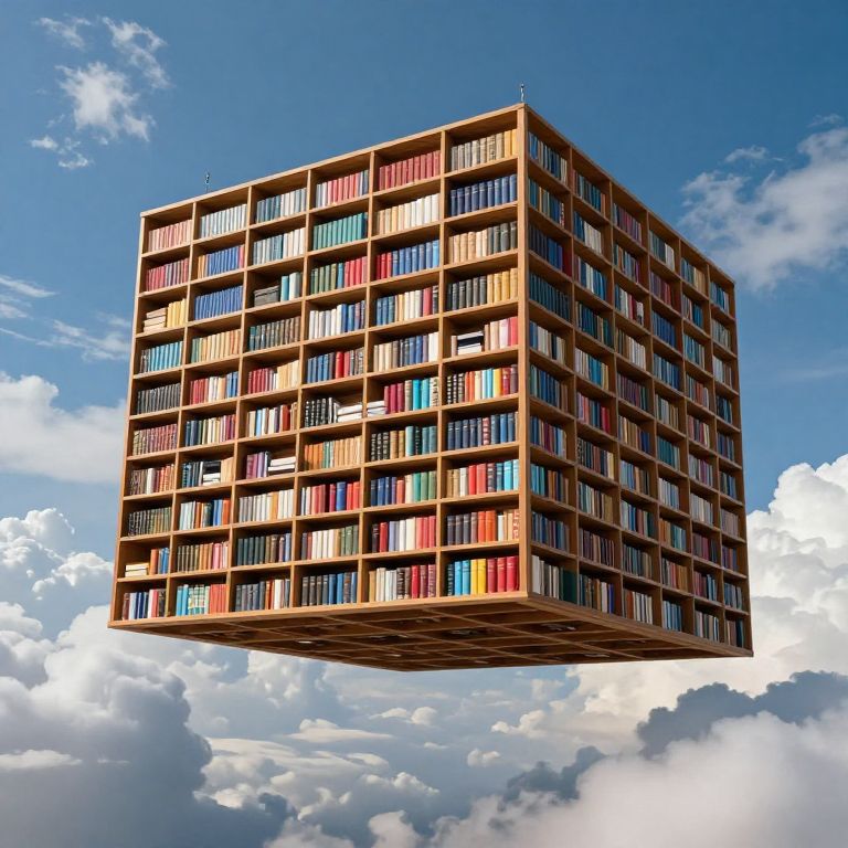 A massive, suspended bookshelf brimming with colorful volumes defies gravity, hovering serenely amidst swirling clouds and a celestial blue expanse, inviting the curious into a realm where knowledge floats freely.