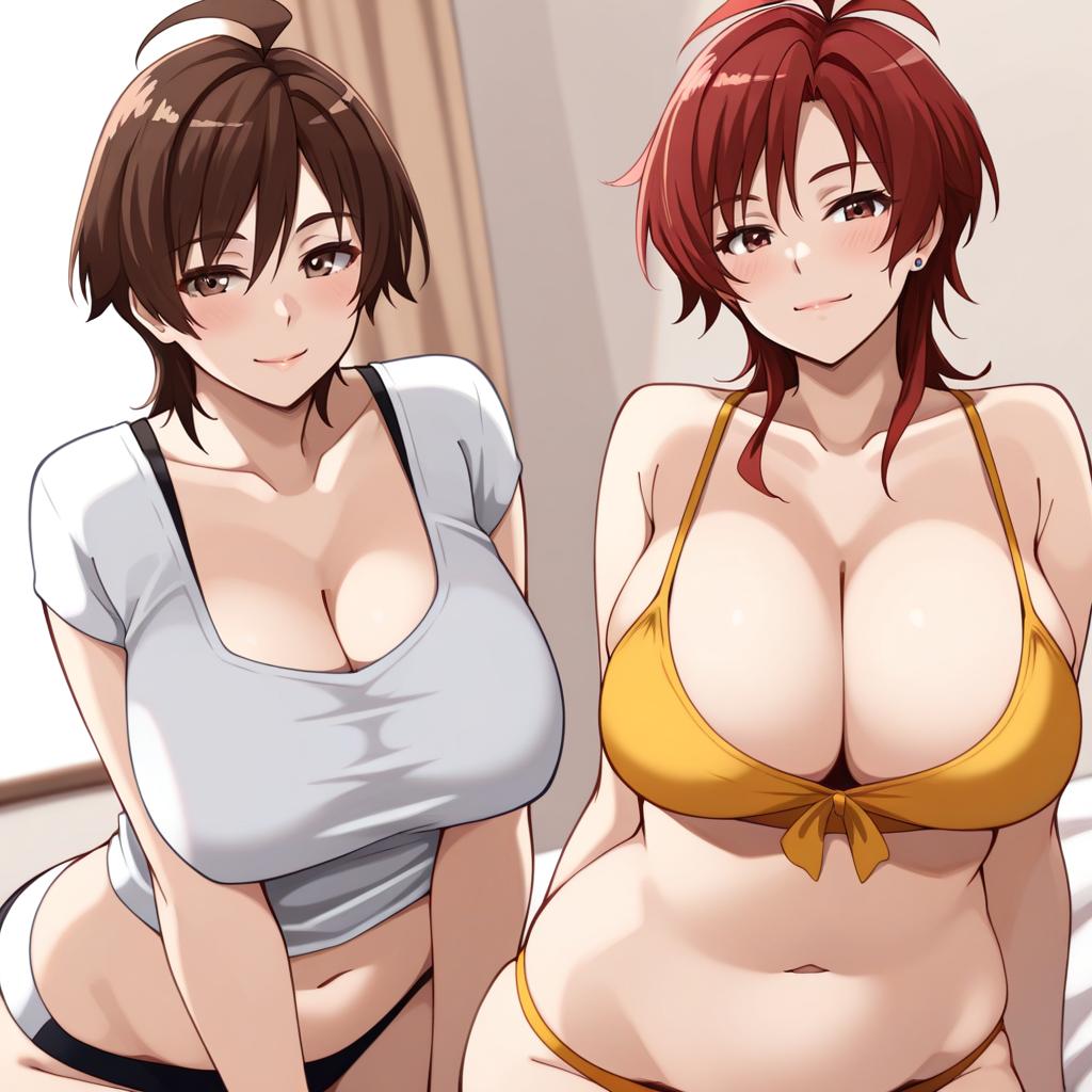 Digital artwork of two mature anime women with large breasts posing indoors. One has short brown hair and brown eyes, wearing a tight white cropped t-shirt and black underwear. The other has red hair, brown eyes, and is dressed in a yellow bikini top and matching bottoms. Both have clear skin, visible cleavage, and soft expressions.