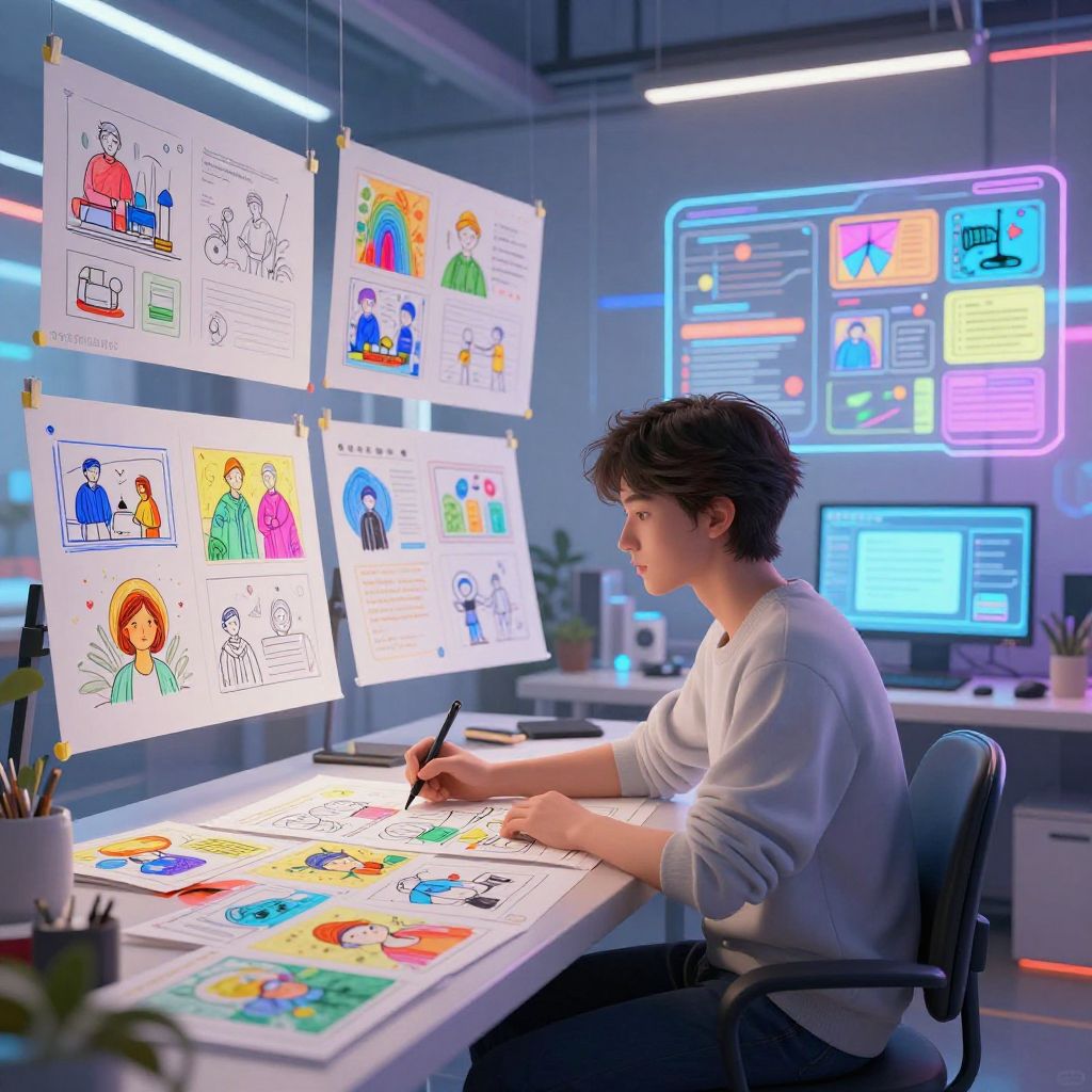 AI for illustration, a creative AI entity generating endless streams of colorful sketches and storyboards in a futuristic studio, filled with floating holograms and digital canvases, soft neon lighting highlights the synergy between algorithmic power and artistic expression.