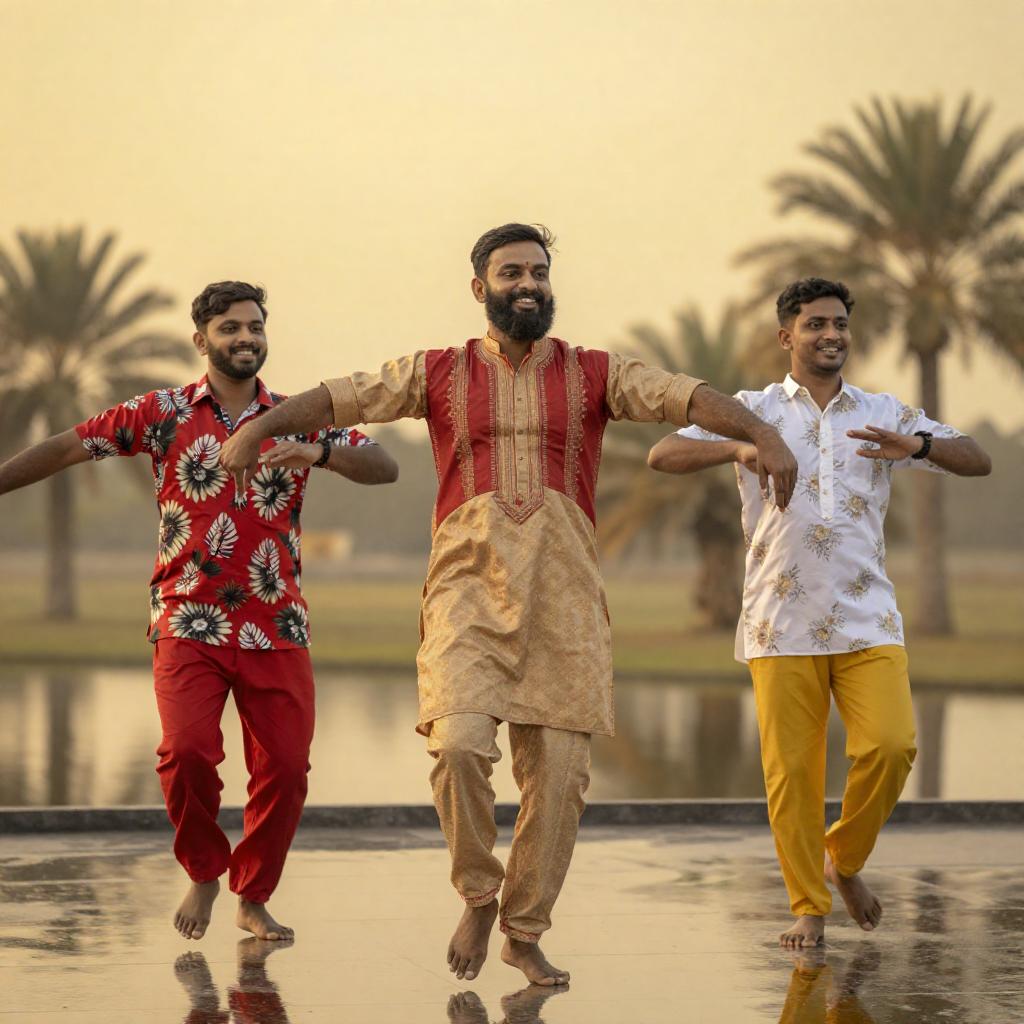 Group of eight men, cheering, with raised hands and enthusiastic expressions. Central man in black suit and white shirt, standing on shoulders, yelling. Bearded men, one in blue turban, wearing traditional white and beige clothing. Pillars in background. Raining. Hands pointing, fists raised. Energetic, joyful scene.