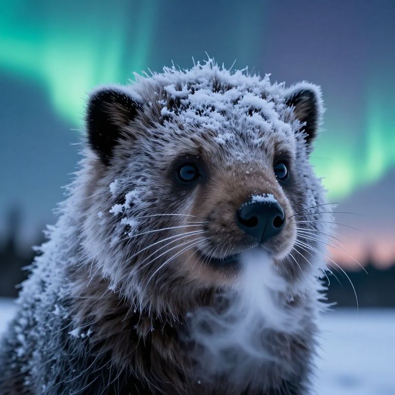 Photograph of a close-up, snowy otter with a thick, frosty coat of fur. The otter's dark brown eyes and black nose stand out against its white-frosted face and whiskers. The background features a blurred aurora borealis with green and blue lights, creating a vibrant, cold night scene. Snow covers the otter's head and neck, contrasting with its dark fur. The image has a sharp focus on the otter, highlighting the texture of its fur and the snow, while the background is softly blurred, emphasizing the otter as the main subject.